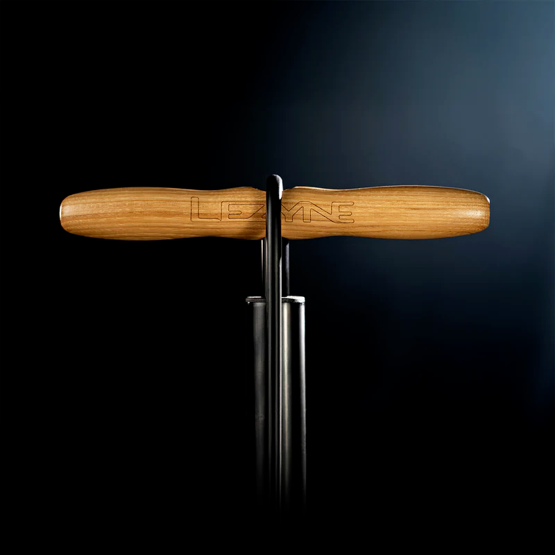 The pump construction features high-strength steel and aluminum, accented by a classic wooden handle. Thanks to the HV (High Volume) system, the pump moves a large volume of air with each stroke, which is ideal for quickly filling wide tires.