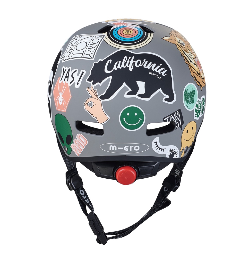 The Micro Sticker helmet combines safety and cool design. The helmet is adjustable, has extra padding, an innovative easy-to-close magnetic fastener, and a red LED light.