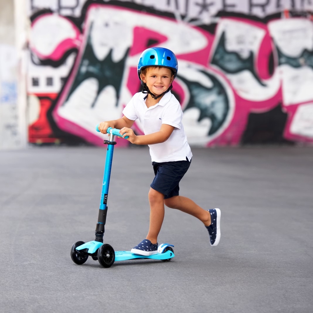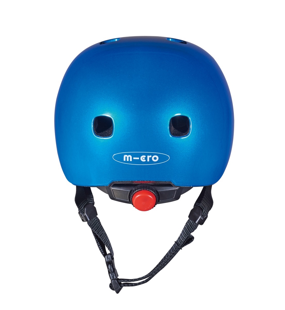 The Micro Blue Metallic helmet is adjustable, has extra padding and a red LED light.