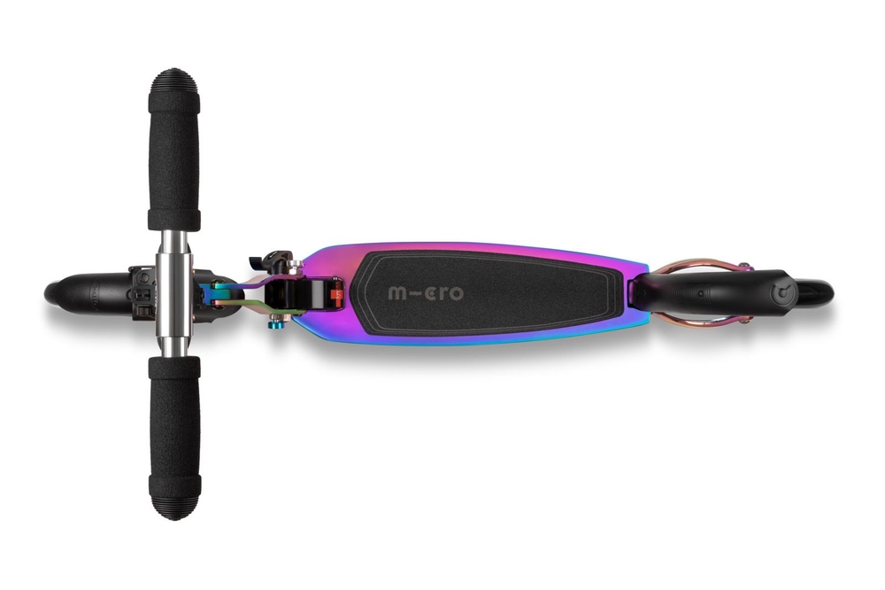 Micro Classic neochrome tõukerattal on silmapaistev neokroomne viimistlus. See spetsiaalne kate loob ainulaadse värvimuutuse efekti, mis varieerub sõltuvalt valgustingimustest.