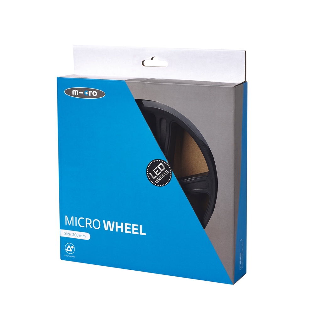 Spare wheel with LED lights for Micro Cruiser scooter (size 200 mm). The LED lights flash when the scooter is in motion. The light is generated in the wheels by a dynamo mechanism and, thanks to inductive charging, no batteries are required. Wheels with LED lights make your child more visible in the dark and riding more fun for them!