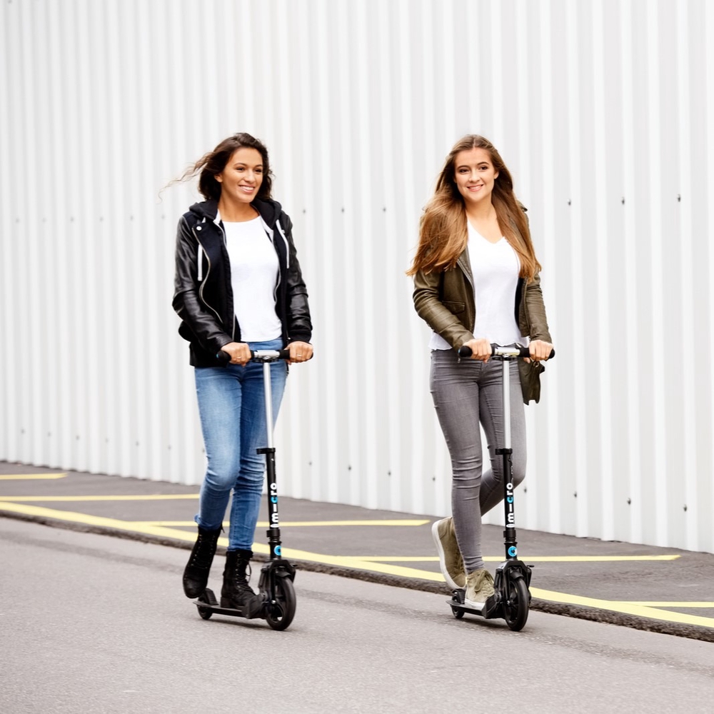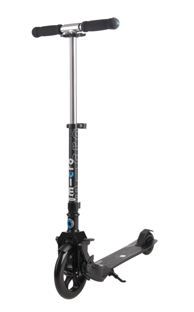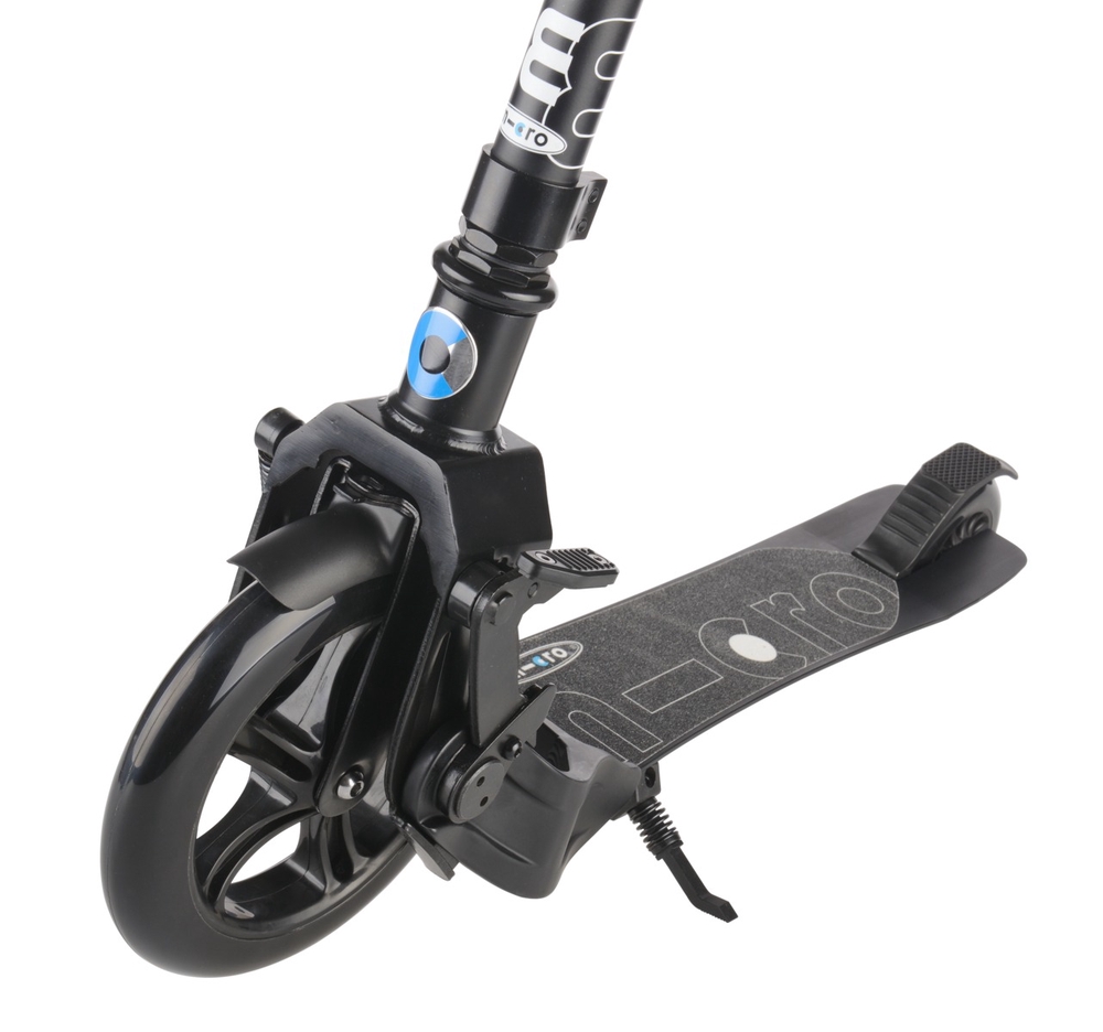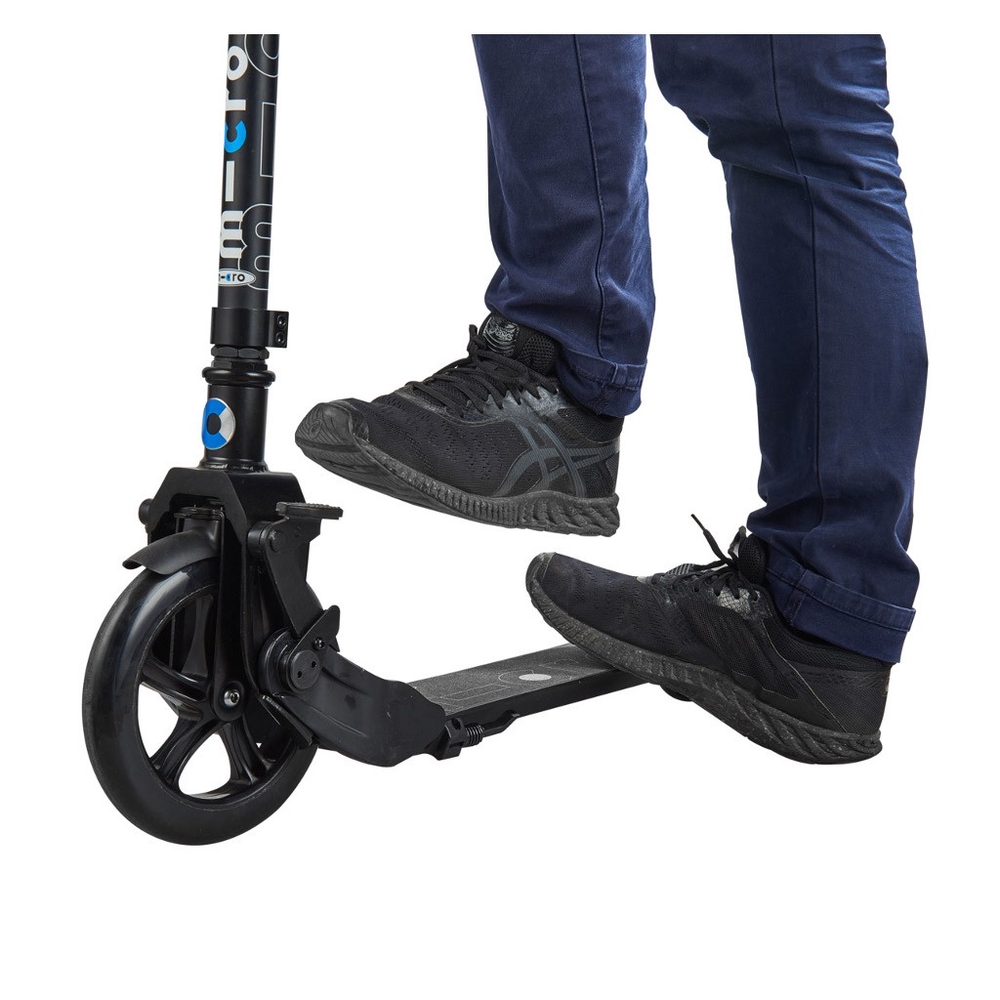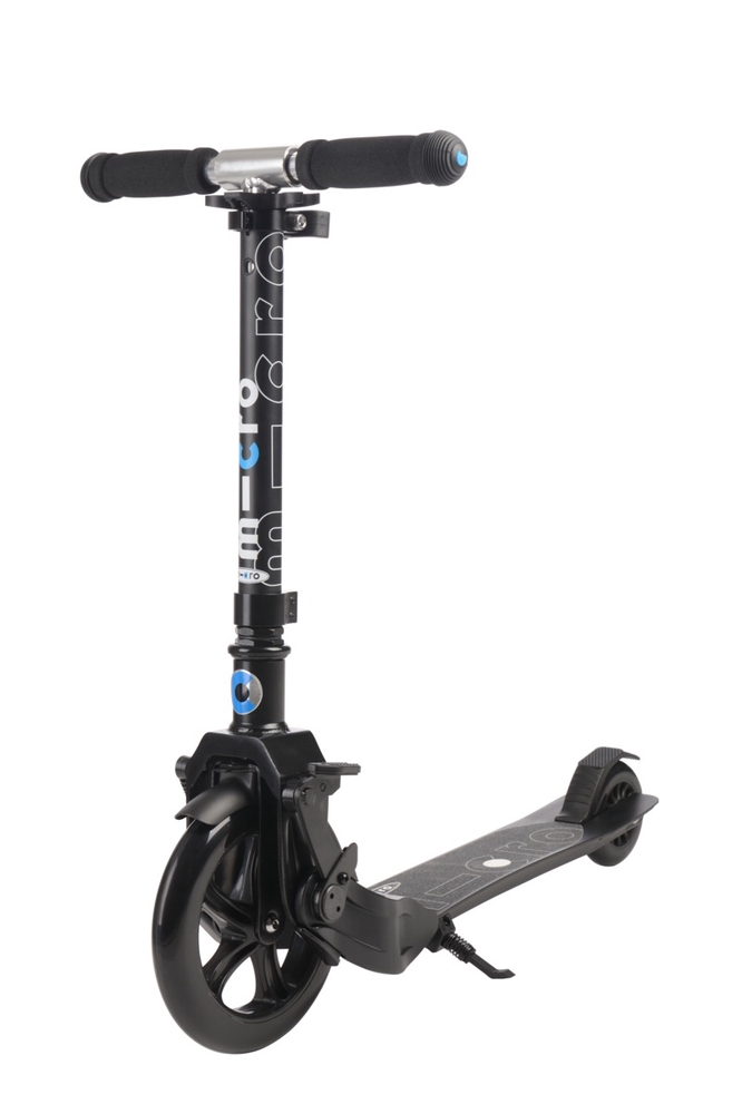 The Micro Eazy scooter has an automatic folding system, i.e. when you push it with your foot, the scooter folds itself. This means you don’t have to bend down or make any extra movements to fold or unfold the scooter. When folded, the Eazy scooter can be pulled behind you like a cart. The scooter can be unfolded again very quickly and is ready to ride. This scooter has a large front wheel and a smaller rear wheel. The large front wheel allows you to overcome obstacles more smoothly and ride comfortably even on bumpy roads. The footboard is ergonomically low for easier pushing and getting on and off.