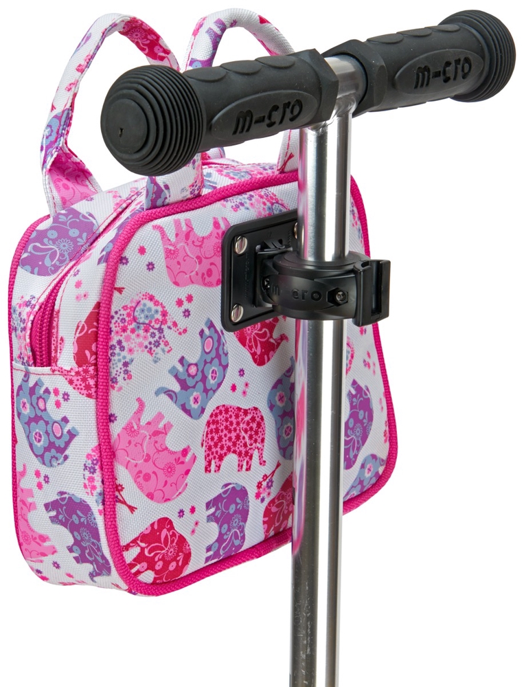Micro handbag for attaching to a scooter and carrying snacks or other important items for children.