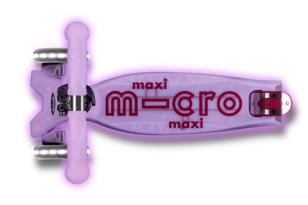 The Micro Maxi Deluxe is the most popular and recommended three-wheeled scooter for children aged 5-12. It is designed for children who have outgrown the Mini Deluxe version but are not yet ready to ride a two-wheeled scooter. The Maxi Deluxe balance bike is designed for older children, which is why it has a larger footboard than the Mini version and the handlebar can be adjusted to a significantly higher position. The lowest position of the Maxi Deluxe handlebar is similar to the highest position of the Mini version handlebar. The Micro Maxi Deluxe Glow LED scooter is an upgraded version of the Maxi Deluxe model, which is pastel-colored in daylight but magically comes to life in the dark, with the scooter's deck, handles, brakes, and logo on the handlebar glowing. LED lights on the wheels add to the magical glow, making the child more visible in the dark and the ride more exciting for the child! With this scooter, you will shine as brightly as a star! The scooter encourages children to get out into the fresh air, helping to develop their balance, coordination, and motor skills. Micro scooters have been developed in collaboration with Swiss medical professionals and designed to support child development.
