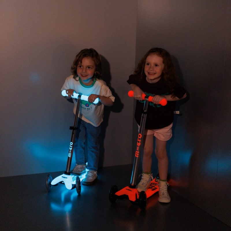 No batteries or rechargeable batteries are needed to make the Micro Maxi Deluxe Glow LED scooter glow. The scooter stores energy from sunlight and UV lamps, which is later converted into a glowing effect. The LED lights start to glow when the scooter is in motion thanks to a dynamo mechanism, making your child even more visible in the dark.