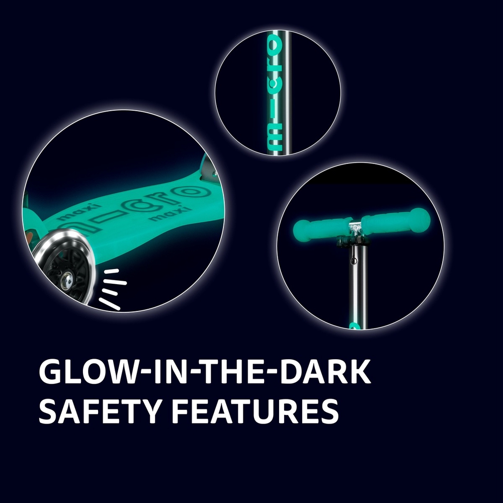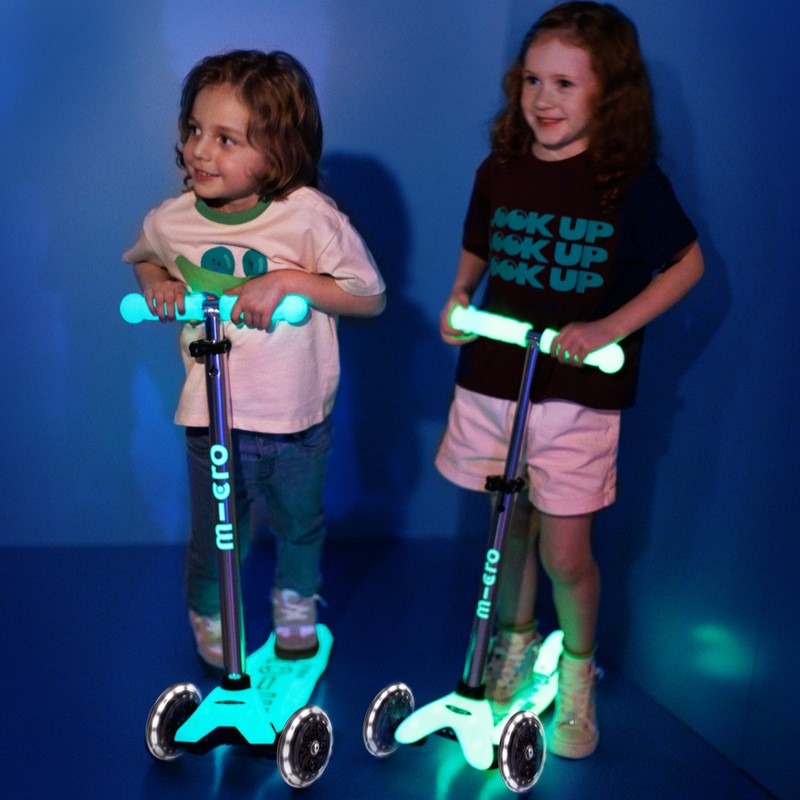 No batteries or rechargeable batteries are needed to make the Micro Maxi Deluxe Glow LED scooter glow. The scooter stores energy from sunlight and UV lamps, which is later converted into a glowing effect. The LED lights start to glow when the scooter is in motion thanks to a dynamo mechanism, making your child even more visible in the dark.