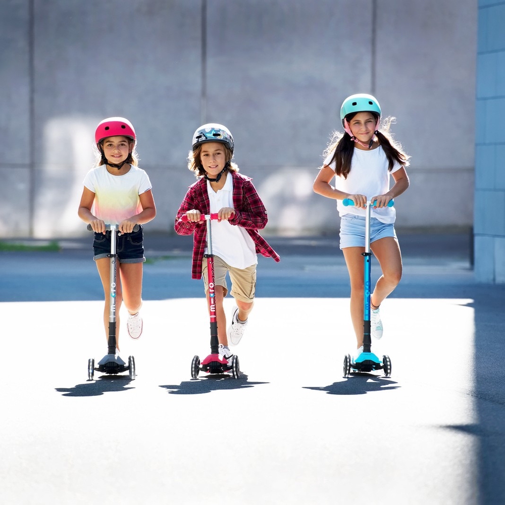 Micro Maxi Deluxe is the most highly rated and recommended three-wheeled scooter in the 5-12 age category. It is designed for children who have outgrown the Mini Deluxe version but are not yet ready to ride a two-wheeled scooter. The Maxi Deluxe scooter is designed for older children, which is why it has a larger footboard than the Mini version and the handlebar can be adjusted to a significantly higher position. The lowest position of the Maxi Deluxe handlebar is similar to the highest position of the Mini version handlebar. The Micro Maxi Deluxe LED foldable scooter is an upgraded version of the Maxi Deluxe model, which, in addition to all the usual Maxi Deluxe features, has two LED lights on the front wheels and can be folded with a single simple movement if necessary. This makes the scooter easier to carry or store. The scooter encourages children to get out into the fresh air, helping to develop their balance, coordination, and motor skills. Micro scooters have been developed in collaboration with Swiss medical professionals and designed to support child development.