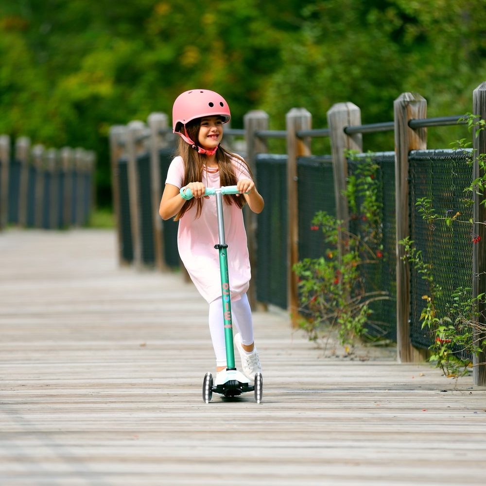 Micro Maxi scooters have a unique patented steering mechanism, which means that, in addition to steering with the handlebar, the scooter can also be steered by leaning your body weight. This ensures better balance and smoother movement for small children. Thanks to the soft polyurethane wheels and durable fiberglass-reinforced deck, the ride is smooth even on bumpy roads. As the wheels do not leave marks on the floor, this scooter is also suitable for indoor use. The Micro Maxi Deluxe scooter is also a very good choice when it comes to your child’s safety. The adjustable handlebar height allows the scooter to grow with your child (a handlebar that is too low can make riding dangerous for your child). The fiberglass-reinforced footboard, which is closer to the ground, and the double front wheels ensure stability. The lightweight frame, non-slip deck and easy-to-use brake make it easy for your child to control their scooter. Soft, rounded edges help prevent injuries and make the scooter more comfortable for your child to ride. The T-shaped handlebar is securely attached and can be removed by parents if necessary by pressing a button under the footboard. This makes the scooter easier to store or transport when necessary. Micro scooters are very durable and can be enjoyed by at least 3-4 children in a row. If necessary, wear parts (wheels, handles, brakes) can be replaced or the appearance of the scooter can be updated with various accessories designed for scooters (bell, bottle holder, basket, etc.).