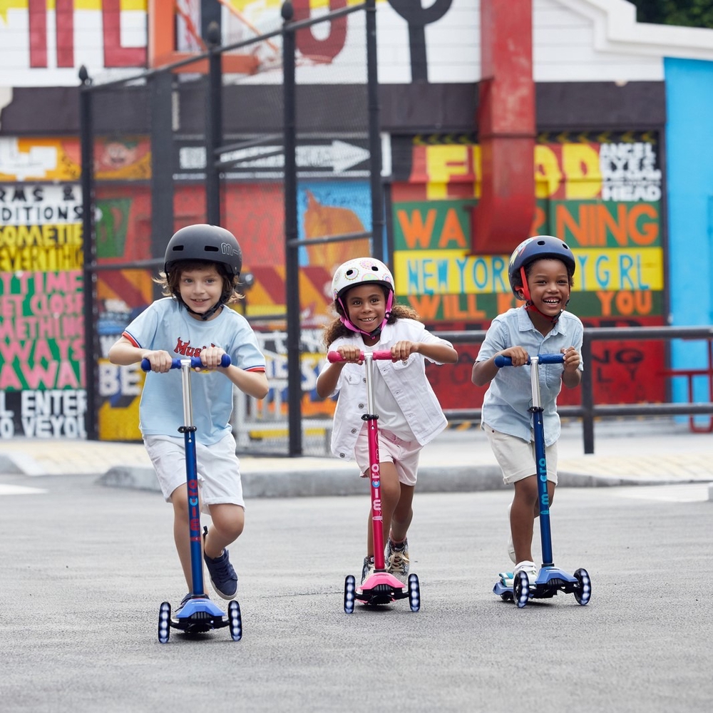Micro Maxi Deluxe is the most popular and recommended three-wheeled scooter for children aged 5-12. It is designed for children who have outgrown the Mini Deluxe version but are not yet ready to ride a two-wheeled scooter. The Maxi Deluxe scooter is designed for older children, which is why it has a larger footboard than the Mini version and the handlebar can be adjusted to a significantly higher position. The lowest position of the Maxi Deluxe handlebar is similar to the highest position of the Mini version handlebar. The Micro Maxi Deluxe LED scooter is an upgraded version of the Maxi Deluxe model, which, in addition to all the usual Maxi Deluxe features, has two LED lights on the front wheels. The wheels light up when the scooter is in motion thanks to a dynamo mechanism, so there is no need for batteries or rechargeable batteries. The LED wheels make your child more visible in the dark and make riding more exciting for them! With this scooter, you'll shine like a star! The scooter encourages children to get out into the fresh air, helping to develop their balance, coordination, and motor skills. Micro scooters have been developed in collaboration with Swiss medical professionals and designed to support child development.