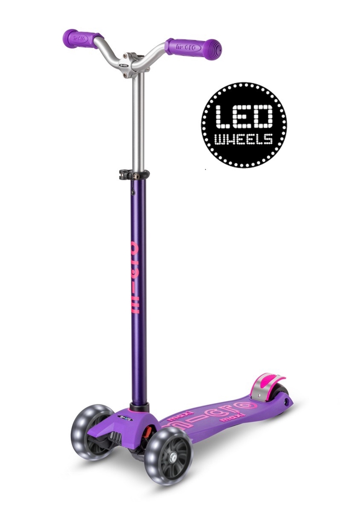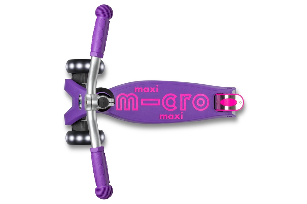 The Micro Maxi Deluxe Pro’s wider and more ergonomic handlebar makes the scooter easier to control and more comfortable to ride. Wider front wheels with LED lights ensure a better riding experience and stability. The lowest position of the handlebar on the Maxi Deluxe Pro model is slightly higher than on the standard Maxi Deluxe scooter, which may make the Maxi Deluxe scooter more comfortable to ride for younger or smaller children.
