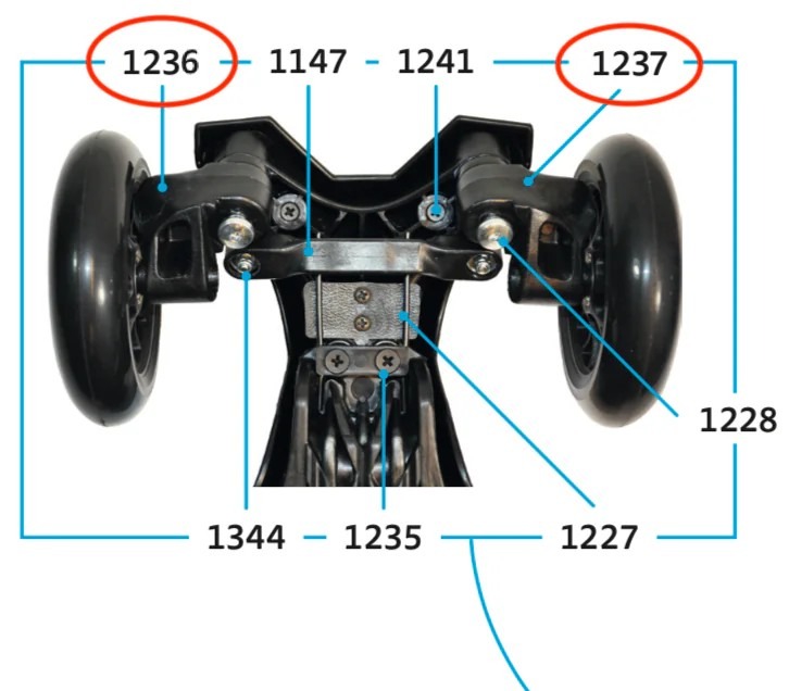 Micro Maxi scooter left wheel pivot. Check the code on the other picture to see if you need a right or left pivot. To replace the pivot, you must first remove the footplate.