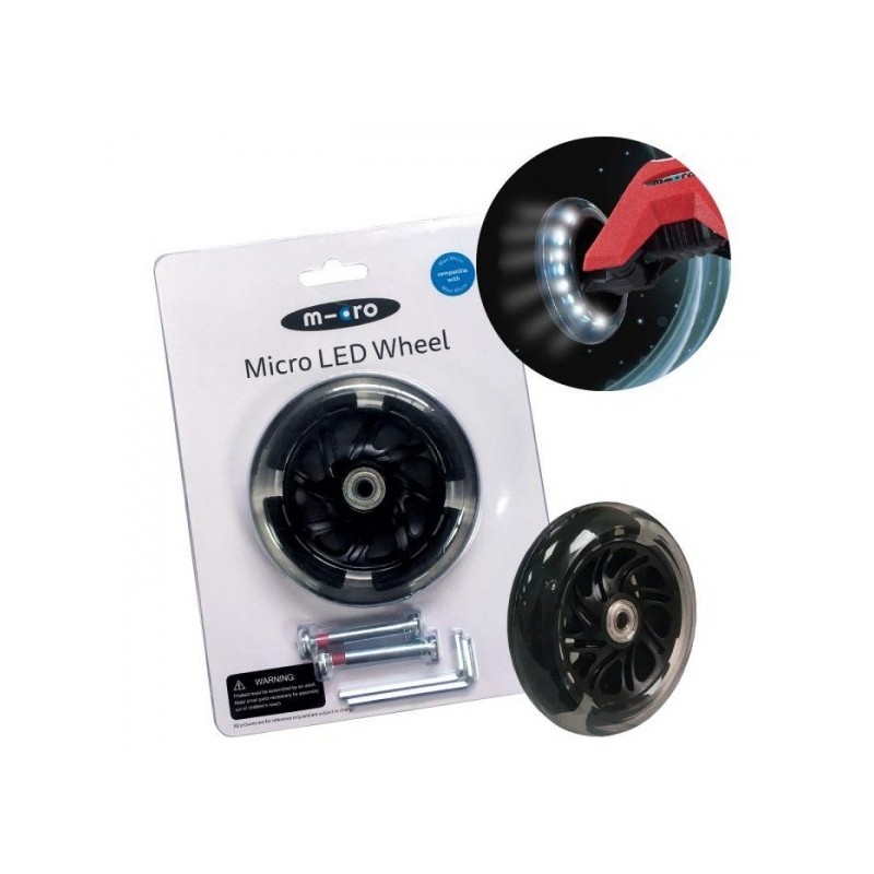 Micro Maxi front wheels with LED lights, diameter 120 mm (ABEC 9 bearings). The front wheels of the Micro Maxi Deluxe model are narrower than those of the Maxi PRO model, so these wheels are only suitable for Micro Maxi Classic and Deluxe models. The set includes two LED wheels. The wheels are made of non-marking material. The LED lights start flashing when the scooter is in motion. The light is generated in the wheels by a dynamo mechanism and, thanks to inductive charging, no batteries are required. The LED lights make the child more visible in the dark and make riding more fun for the child! https://www.youtube.com/watch?v=Qv_-dW2wHTs