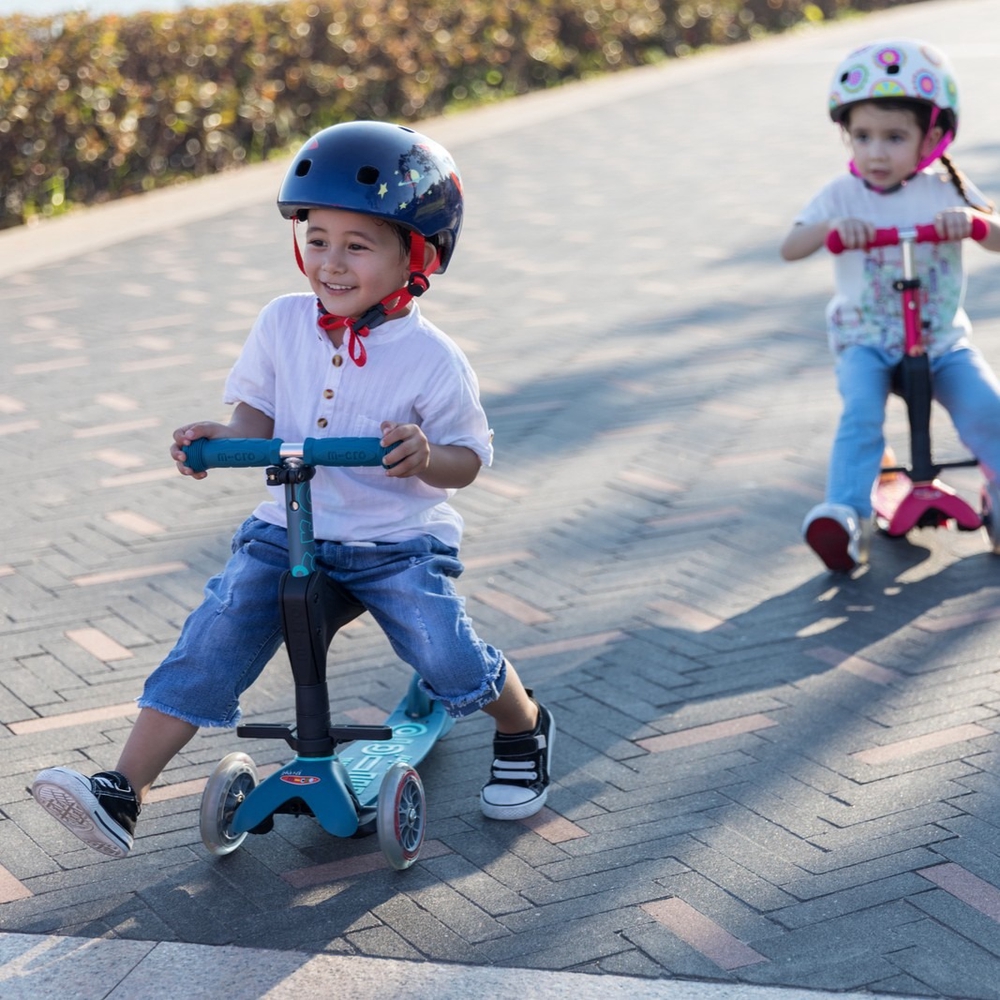 Micro Mini scooters have a unique patented steering mechanism, which allows you to steer the scooter by leaning your body weight in addition to using the handlebar. This ensures better balance and smoother movement for small children. Thanks to the soft polyurethane wheels and durable fiberglass-reinforced footboard, the ride is smooth even on bumpy roads. As the wheels do not leave marks on the floor, this scooter is also suitable for indoor use. The Micro Mini Deluxe scooter is also a very good choice when it comes to your child’s safety. The adjustable handlebar height allows the scooter to grow with your child (a handlebar that is too low can make riding dangerous for your child). The fiberglass-reinforced footboard, which is closer to the ground, and the double front wheels ensure stability. The lightweight frame, non-slip deck and easy-to-use brake make it easy for your child to control their scooter. Soft, rounded edges help prevent injuries and make the scooter more comfortable for your child to ride. The T-shaped handlebar is securely attached and can be removed by parents if necessary by pressing a button under the standing board. This makes the scooter easier to store or transport when necessary. Micro scooters are very durable and can be enjoyed by at least 3-4 children in a row. If necessary, wear parts (wheels, handles, brakes) can be replaced or the appearance of the scooter can be updated with various accessories designed for scooters (bell, bottle holder, basket, etc.).