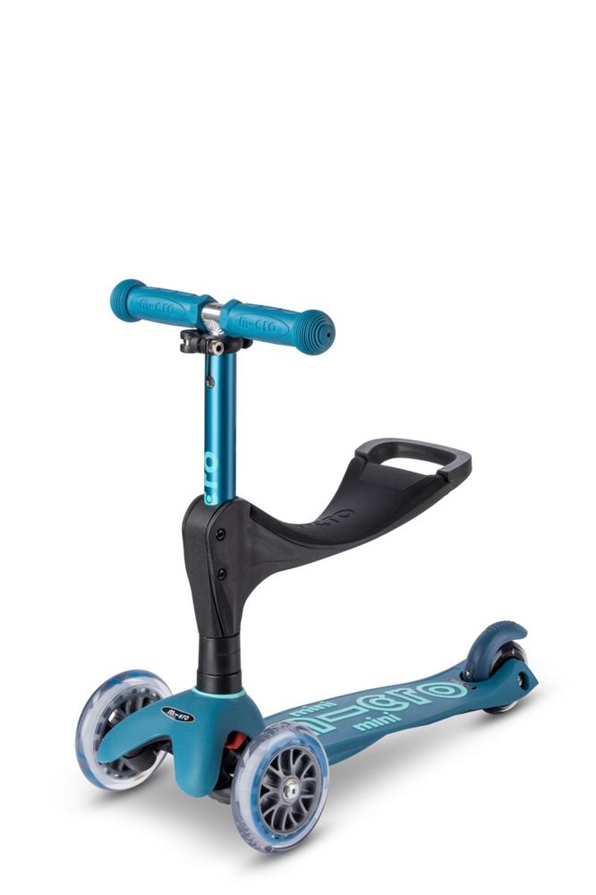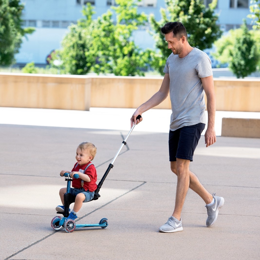 The Micro Mini Deluxe 3in1 Plus seat attaches to the lower bar of the scooter’s handlebar with two bolts included in the set. The push bar is adjustable and attaches to the seat. You can choose between two seat heights: 25 cm or 29 cm.