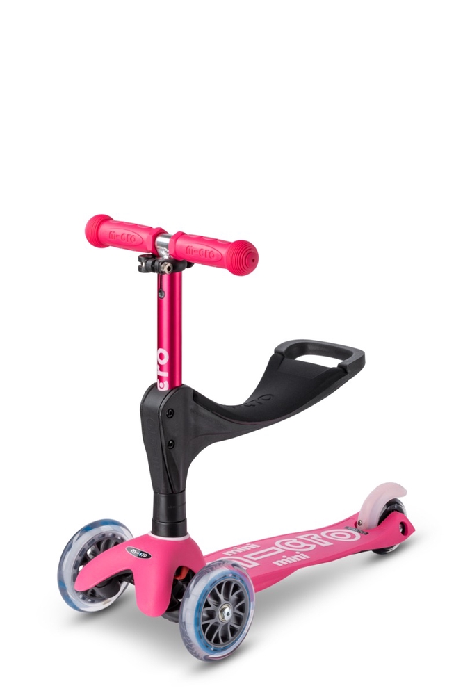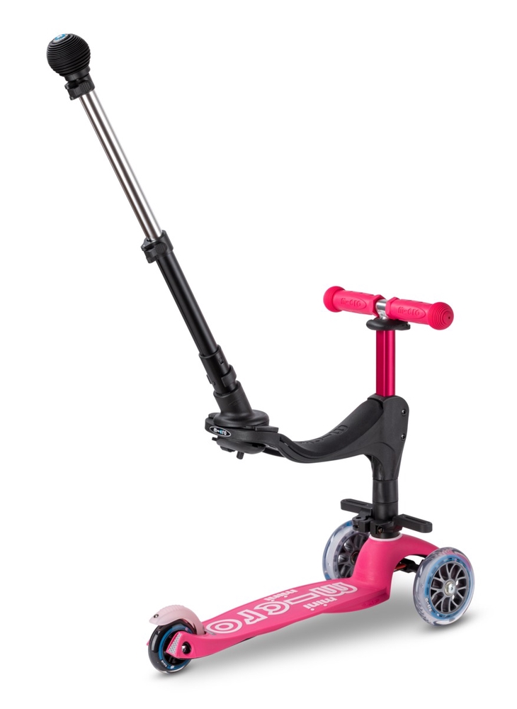 The Micro Mini Deluxe 3in1 Plus seat attaches to the lower bar of the scooter’s handlebar with two bolts included in the set. The push bar is adjustable and attaches to the seat. You can choose between two seat heights: 25 cm or 29 cm.