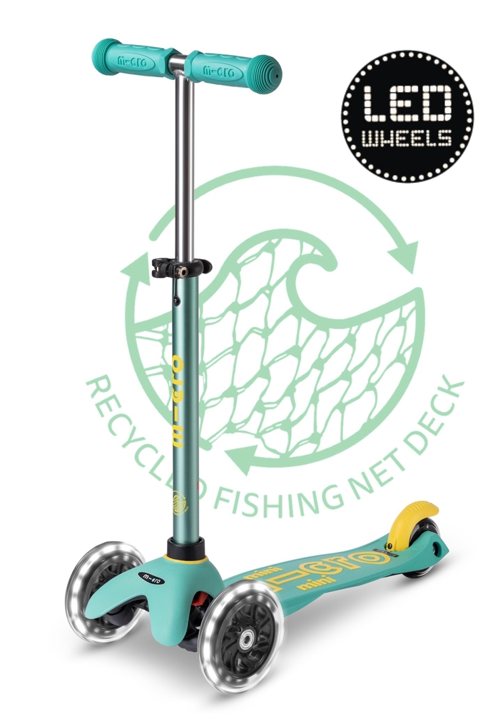 Micro Mini Deluxe is the world's most highly rated and recommended scooter for children aged 2-5. This scooter has won the Toy of the Year award for several years and is one of the lightest scooters on the market! The Deluxe designation in the scooter's name refers to the fact that the height of the handlebar is adjustable, allowing the scooter to grow with your child! The Micro Mini Deluxe ECO LED scooter has all the usual Mini Deluxe features, but it has two LED lights on the front wheels and, unlike other scooters, all ECO series scooters are made from recycled fishing nets, ropes and plastic collected from the oceans. The scooter encourages children to get out into the fresh air, helping to develop their balance, coordination and motor skills. Micro Mini scooters have been developed in collaboration with Swiss medical professionals, specifically with the development of pre-school children in mind.