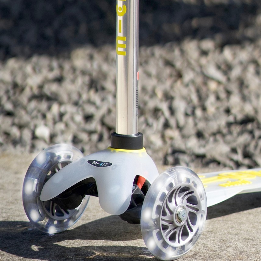 Micro Mini Deluxe Flux LED wheels light up when the scooter is in motion thanks to a dynamo mechanism, so there is no need for batteries or rechargeable batteries. LED lights make your child more visible in the dark and make riding more exciting for them!