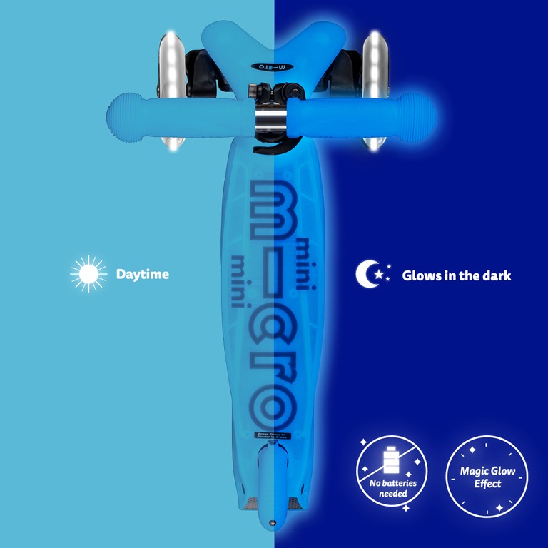 No batteries or rechargeable batteries are needed to make the Micro Mini Deluxe Glow LED scooter glow. The scooter stores energy from sunlight and UV lamps, which is later converted into a glowing effect. The LED lights start to glow when the scooter is in motion thanks to a dynamo mechanism, making the child even more visible in the dark.