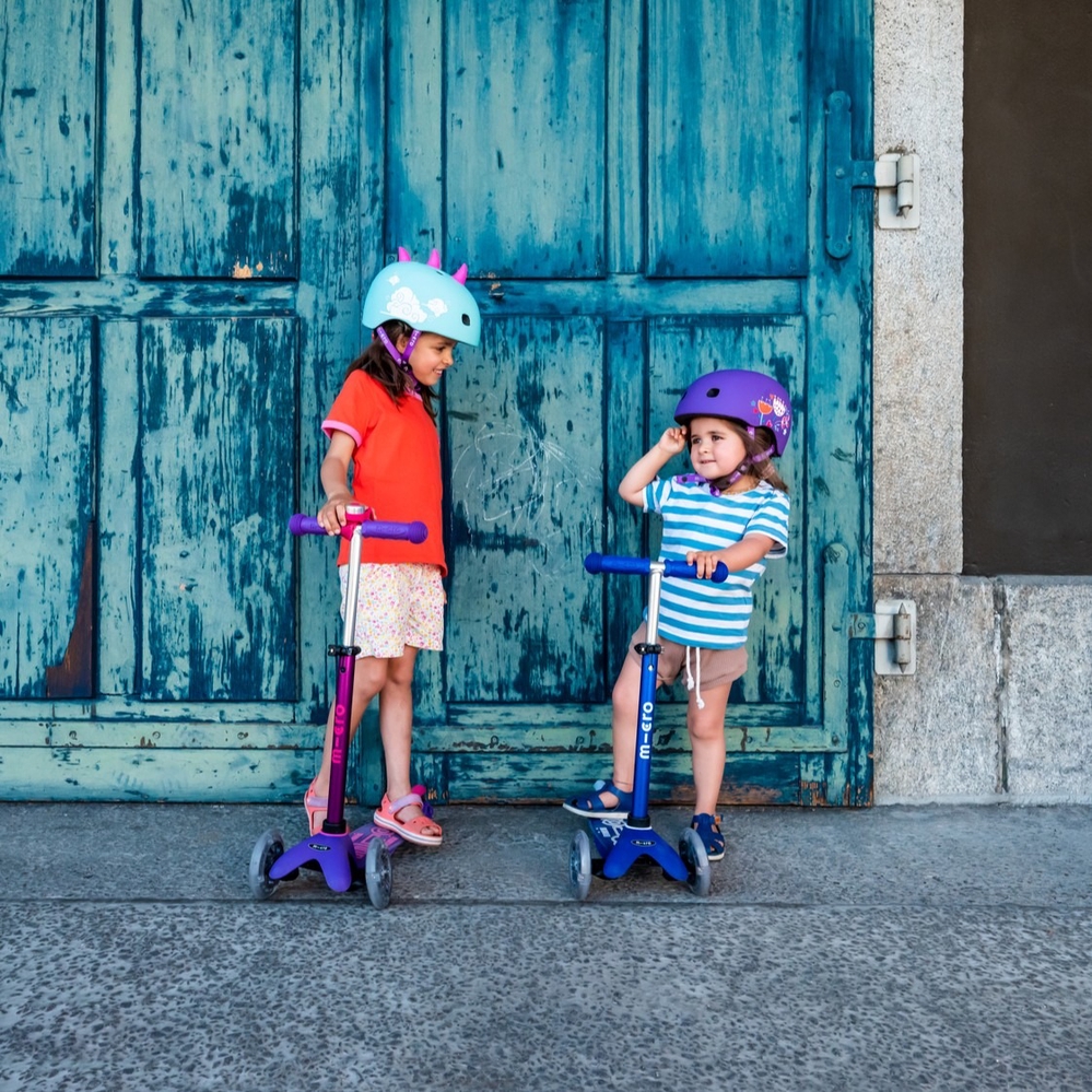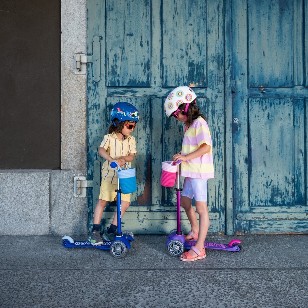 Micro Mini scooters have a unique patented steering mechanism, which means that, in addition to steering with the handlebar, the scooter can also be steered by leaning your body weight. This ensures better balance and smoother movement for small children. Thanks to the soft polyurethane wheels and durable fiberglass-reinforced deck, the ride is smooth even on bumpy roads. As the wheels do not leave marks on the floor, this scooter is also suitable for indoor use. The Micro Mini Deluxe scooter is also a very good choice when it comes to your child’s safety. The adjustable handlebar height allows the scooter to grow with your child (a handlebar that is too low can make riding dangerous for your child). The fiberglass-reinforced footboard, which is closer to the ground, and the double front wheels ensure stability. The lightweight frame, non-slip deck and easy-to-use brake make it easy for your child to control their scooter. Soft, rounded edges help prevent injuries and make the scooter more comfortable for your child to ride. The T-shaped handlebar is securely attached and can be removed by parents if necessary by pressing a button under the footboard. This makes the scooter easier to store or transport when necessary. Micro scooters are very durable and can be enjoyed by at least 3-4 children in a row. If necessary, wear parts (wheels, handles, brakes) can be replaced or the appearance of the scooter can be updated with various accessories designed for scooters (bell, bottle holder, basket, etc.).