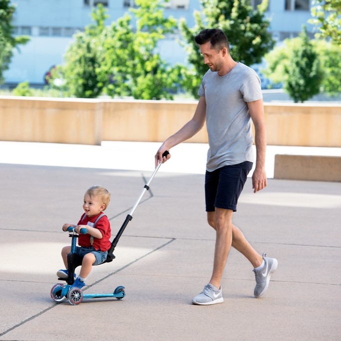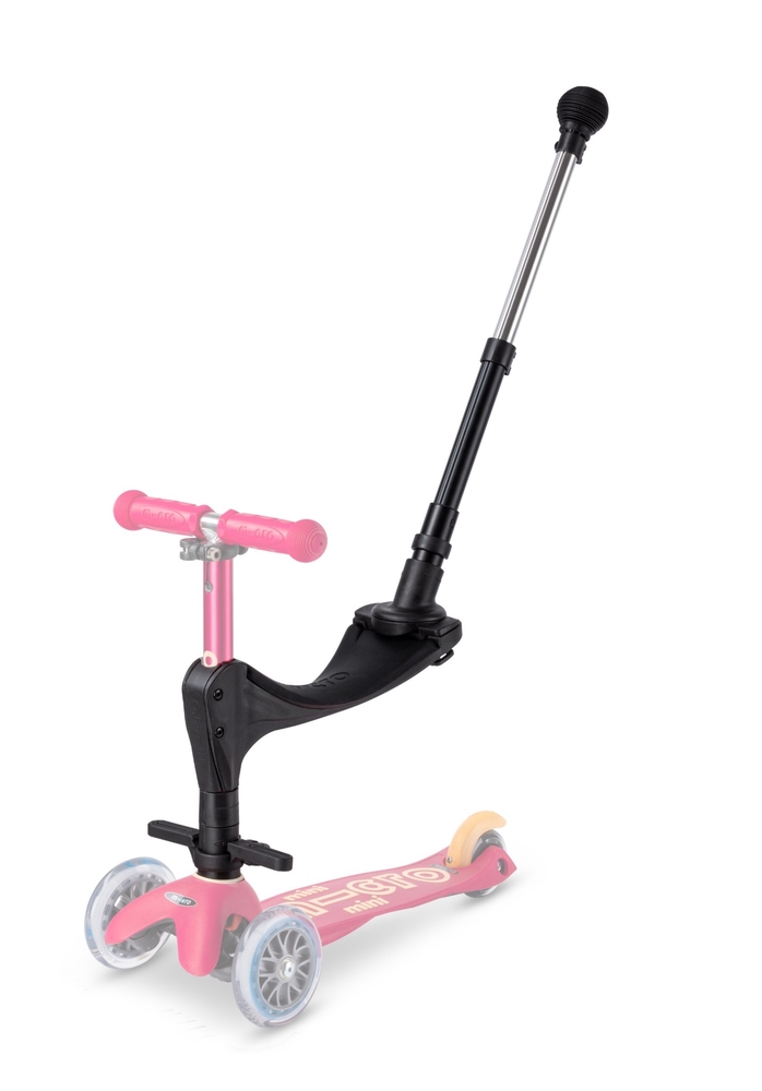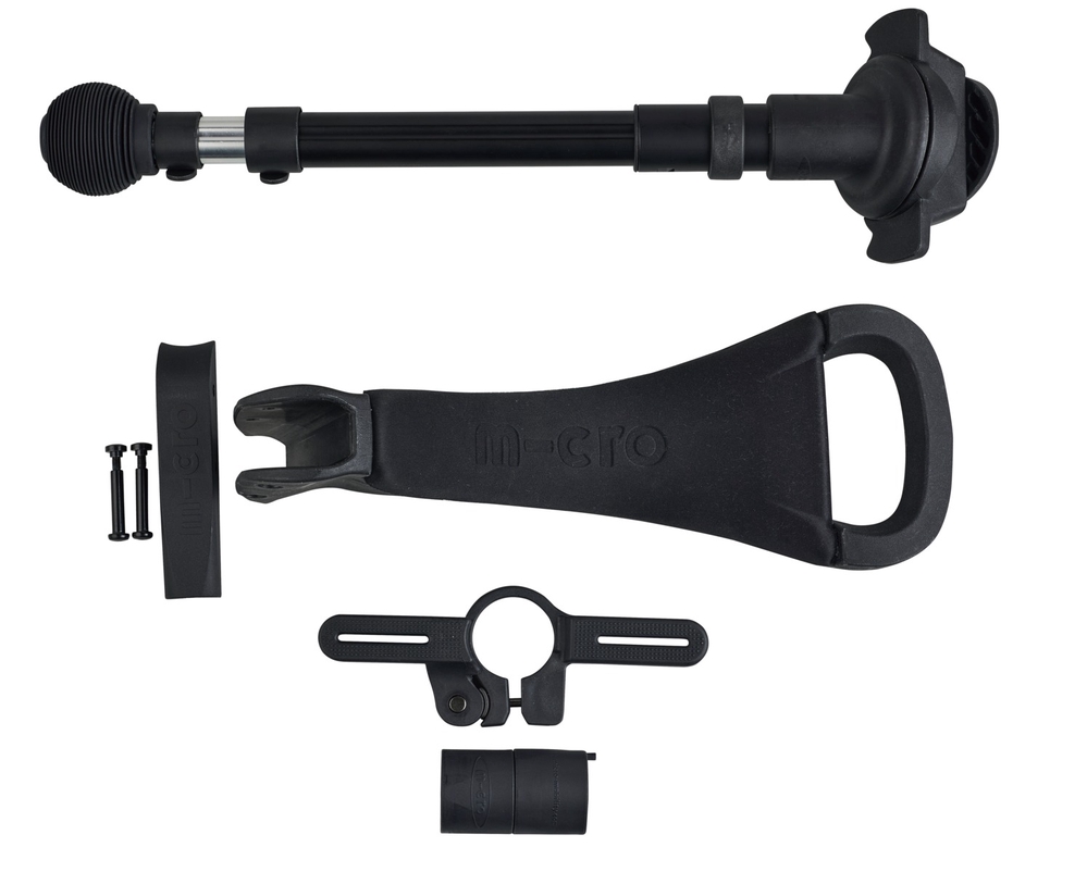 Accessory kit for Micro Mini Deluxe scooters (not compatible with foldable models). The kit includes footrests, seat and push bar. This accessory kit allows the scooter to grow with your child, serving as a vehicle for smaller children with a seat, footrests and push bar controlled by parents, later as a balance bike without the push bar, and finally, all accessories can be removed and the scooter becomes a Micro Mini Deluxe version. The seat is attached to the handlebar of the Micro Mini Deluxe push bike with two bolts included in the set. The push bar is attached to the seat and its height is adjustable.
