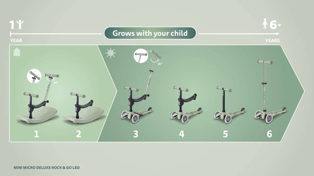 Spetsifikatsioon tootele Micro Mini Deluxe Rock & Go LED children’s scooter, Olive Sage: