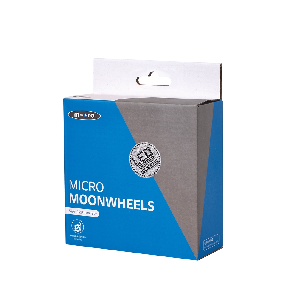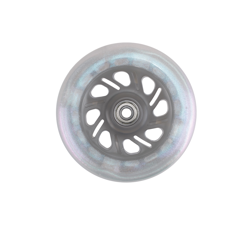 Micro Mini Glitter Moon LED front wheels with a diameter of 120 mm, suitable for scooters. The set includes two LED front wheels with a beautiful glitter finish. Made of non-marking material. The LED lights flash when the scooter is in motion. The light is generated in the wheels by a dynamo mechanism and, thanks to inductive charging, no batteries are required. Wheels with LED lights make your child more visible in the dark and make riding more exciting for them!