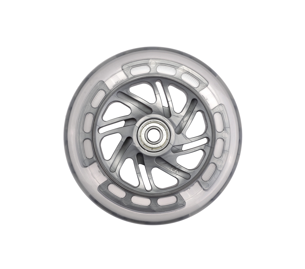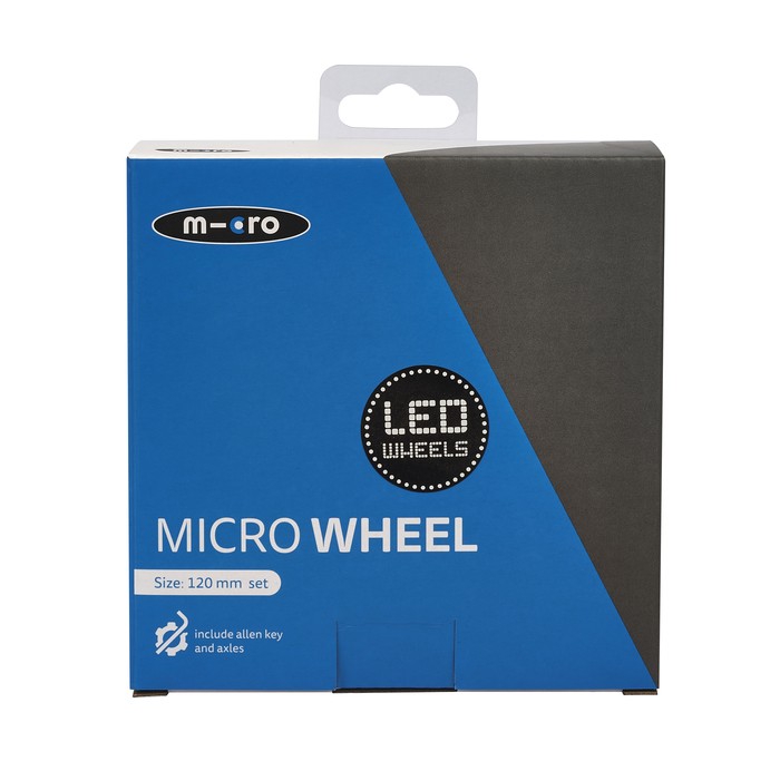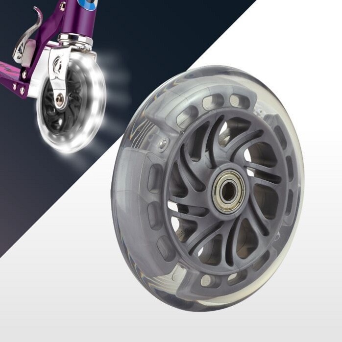 First spare wheel with LED lights, diameter 120 mm, suitable for Micro Sprite and Mini models (including Mini Deluxe, Mini 3in1, Mini2Go, Mini2Grow). The set includes one first LED spare wheel (with ABEC 9 bearings). Made of non-marking material. The LED lights flash when the scooter is in motion. The light is generated in the wheels by a dynamo mechanism and, thanks to inductive charging, no batteries are required. Wheels with LED lights make your child more visible in the dark and make riding more fun for them!