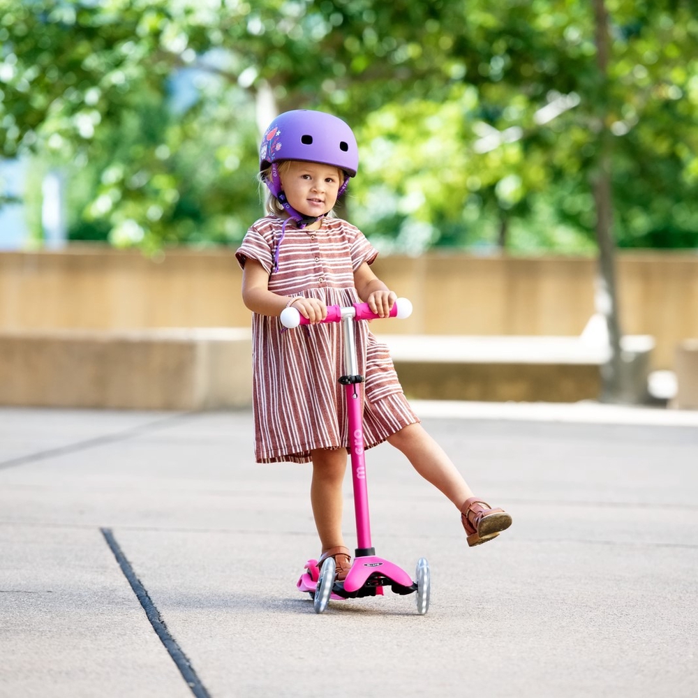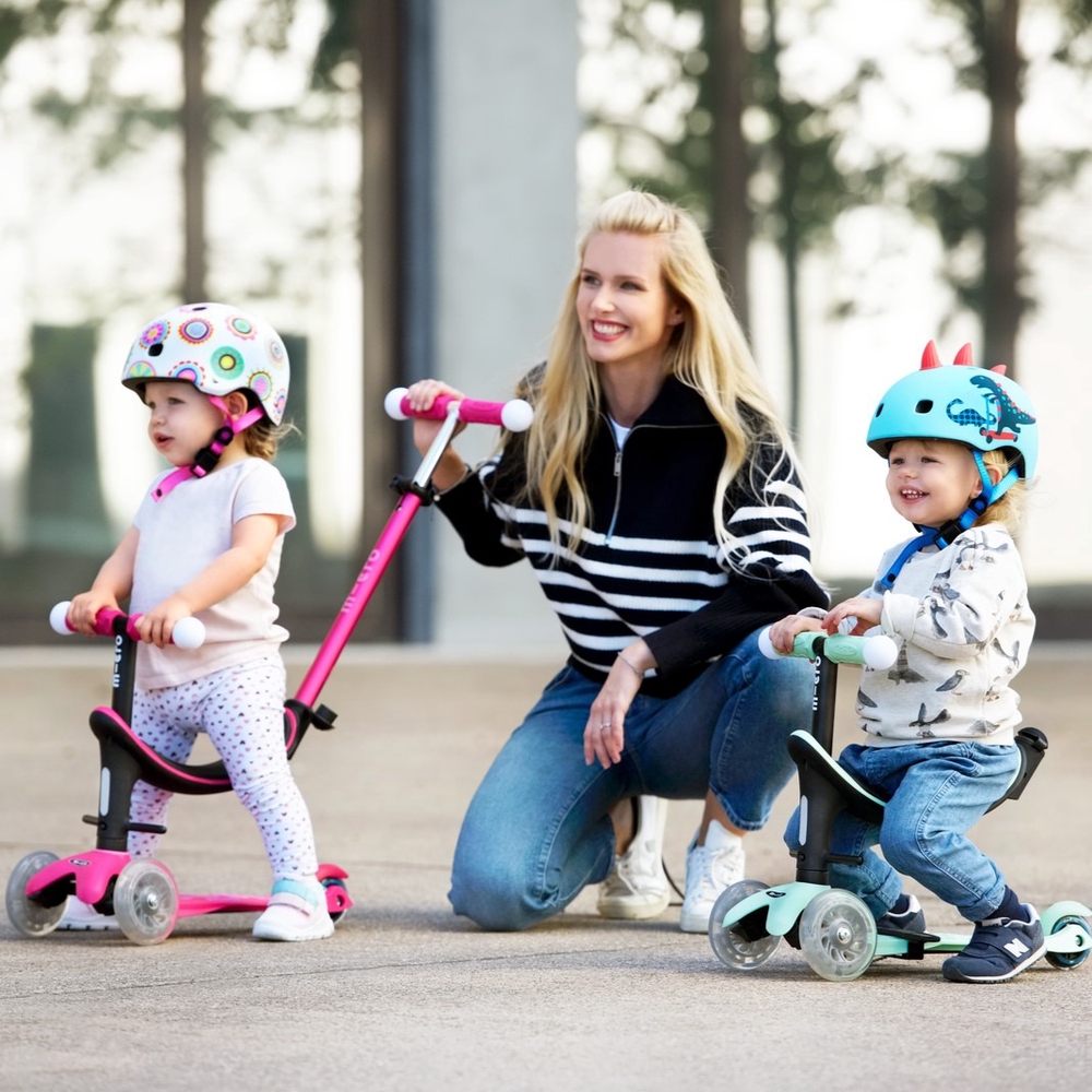 Parents can use the push bar in both horizontal and vertical positions (see video). In the latter case, only one hand is needed to push. Micro Mini scooters have a unique patented steering mechanism, which means that in addition to steering with the handle, the scooter can also be steered by shifting your body weight. This ensures better balance and smoother movement for small children. Thanks to the soft polyurethane wheels and durable fiberglass-reinforced footboard, the ride is smooth even on bumpy roads. As the wheels do not leave marks on the floor, this scooter is also suitable for indoor use. The Micro Mini Deluxe scooter is also a very good choice when it comes to your child’s safety. The adjustable handlebar height allows the scooter to grow with your child (a handlebar that is too low can make riding dangerous for your child). The fiberglass-reinforced footboard, which is closer to the ground, and the double front wheels ensure stability. The lightweight frame, non-slip deck and easy-to-use brake make it easy for your child to control their scooter. Soft, rounded edges help prevent injuries and make the scooter more comfortable for your child to ride. The T-shaped handlebar is securely attached and can be removed by parents if necessary by pressing a button under the footboard. This makes the scooter easier to store or transport when necessary. Micro scooters are very durable and can be enjoyed by at least 3-4 children in a row. If necessary, wear parts (wheels, handles, brakes) can be replaced or the appearance of the scooter can be updated with various accessories designed for scooters (bell, bottle holder, basket, etc.).
