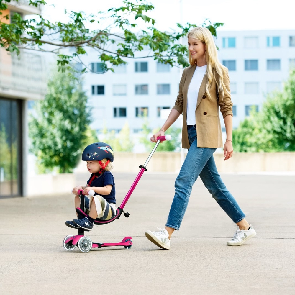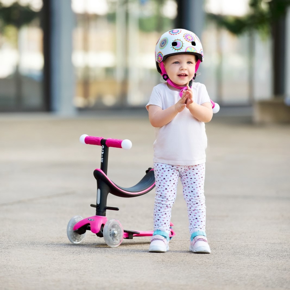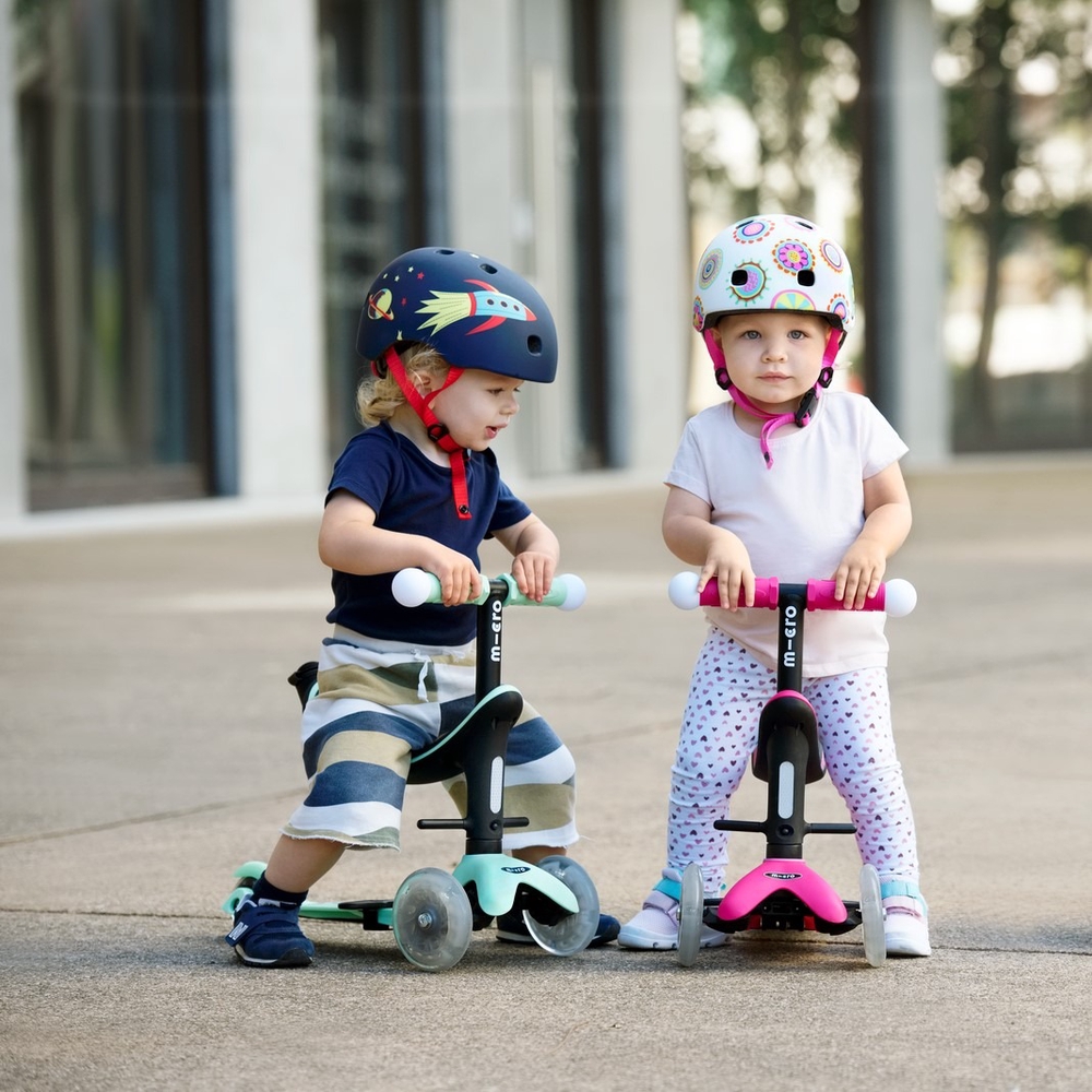 The Micro Mini2Grow Deluxe Magic LED balance bike is an upgraded version of the Mini Deluxe model, suitable for children from 12 months to 6 years of age. This multifunctional ergonomic scooter grows with your child, serving as a vehicle for younger children with a seat, footrests, and a push bar controlled by parents. later, without the push bar, it becomes a balance bike, and finally, all accessories can be removed and the balance bike becomes a sparkling version with Micro Mini Deluxe LED lights on the wheels and handles. With this scooter, you'll shine as brightly as a star! The scooter encourages children to get out into the fresh air, helping to develop their balance, coordination, and motor skills. Micro Mini scooters have been developed in collaboration with Swiss medical professionals, specifically with the development of preschool children in mind.