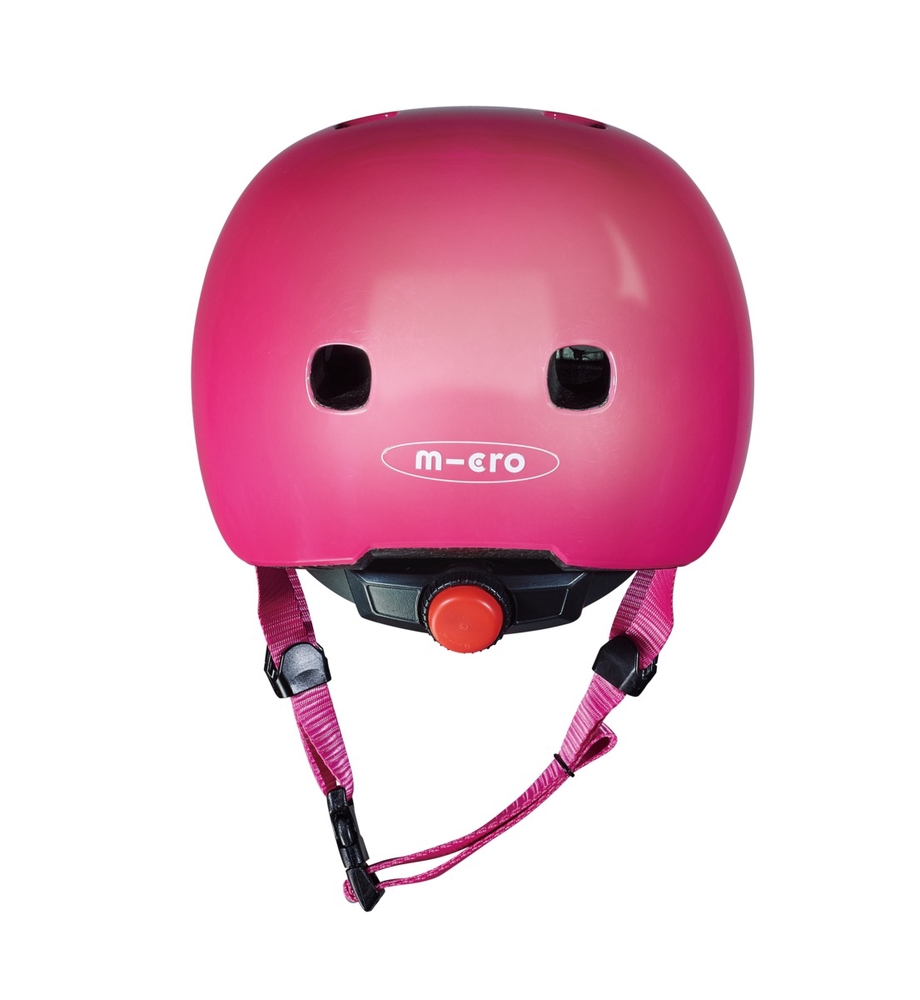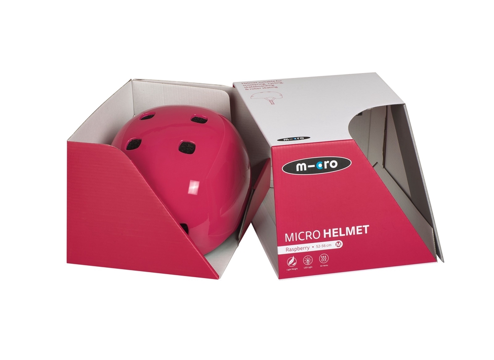 The Micro Raspberry helmet is made of lightweight EPS foam for maximum protection, surrounded by a strong polycarbonate outer protective layer using In-Mould technology.nbsp;The size of the helmet can be adjusted by turning the red knob at the back. Pressing the red button turns on the integrated LED light.