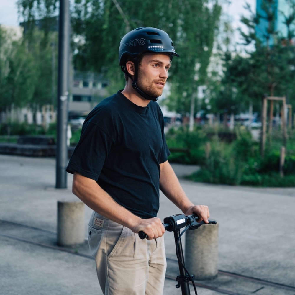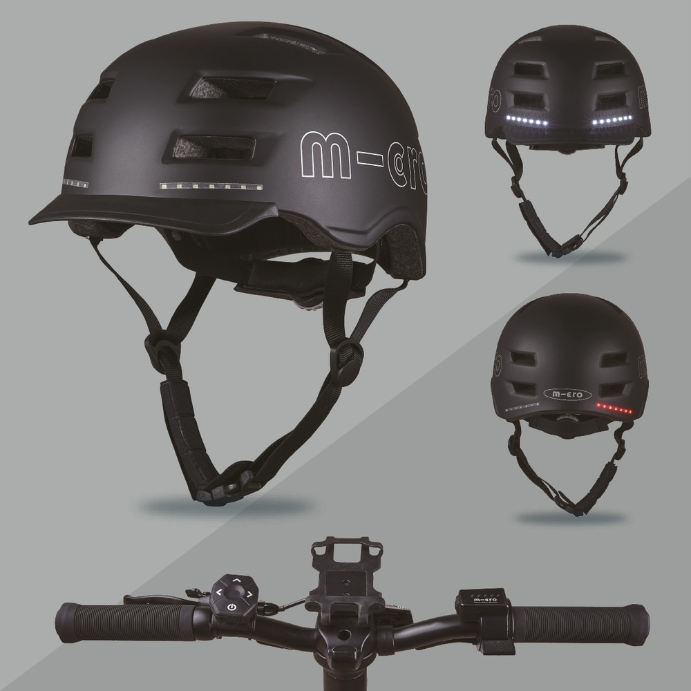 To use the Micro Smart helmet LED light system, attach the remote control that comes with the helmet to the handlebars of your scooter or kick scooter. The light has two modes: steady or flashing. In addition, there is a brake light that is activated by an integrated balance sensor. The remote control allows the rider to signal to other road users whether they want to turn right or left without taking their hands off the handlebars.