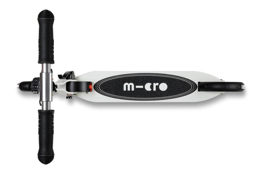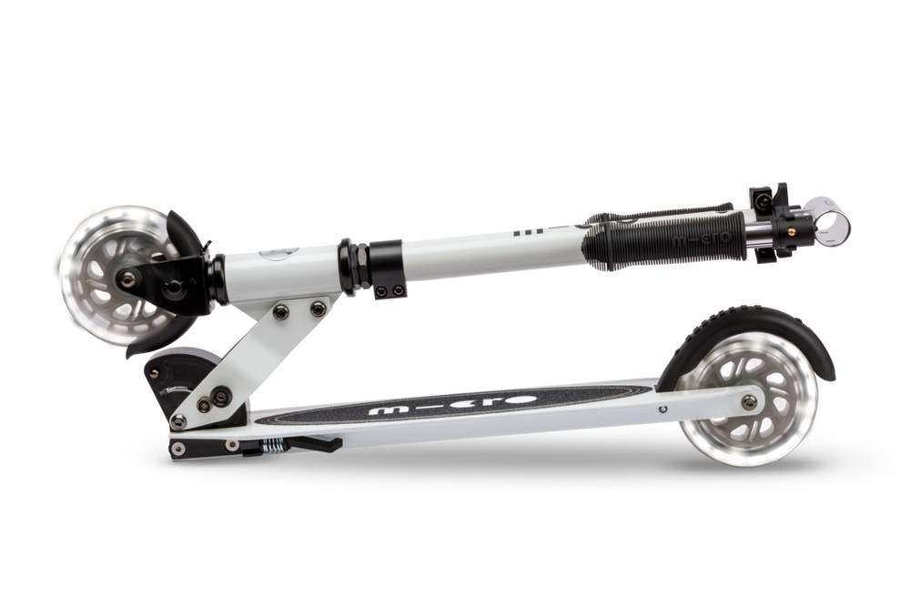 Micro Sprite LED is a compact and lightweight scooter (weighing approx. 2.85 kg) that can be easily folded and carried. It has a durable aluminum frame and an adjustable handlebar. It is well suited for riding on asphalt. Due to its smaller wheels, it is not as well suited for riding on roads with poor surface conditions. It is easier to ride on such roads with a Micro Cruiser scooter, for example, whose larger wheels overcome obstacles more smoothly.