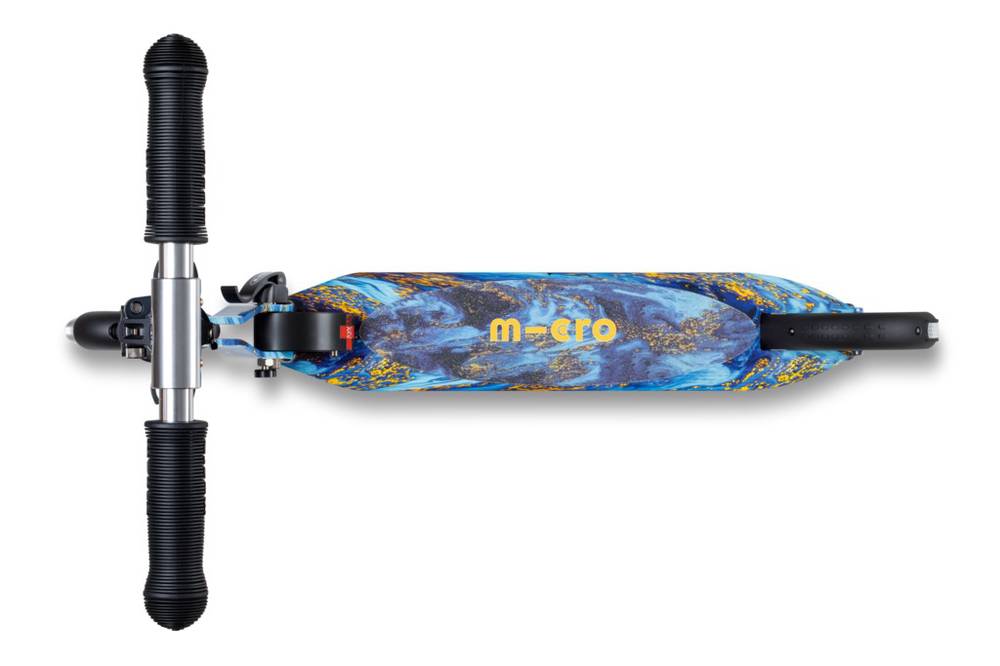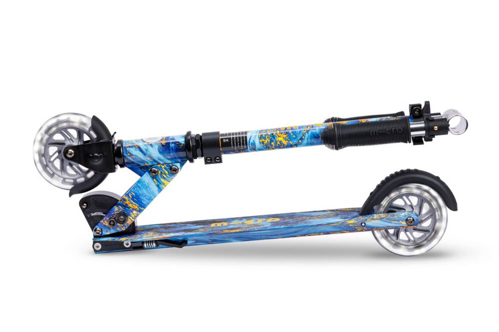 Micro Sprite LED is a compact and lightweight scooter (weighing approx. 2.85 kg) that can be easily folded and carried. It has a durable aluminum frame and an adjustable handlebar. It is well suited for riding on asphalt. Due to its smaller wheels, it is not as well suited for riding on roads with poor surface conditions. It is easier to ride on such roads with a Micro Cruiser scooter, for example, whose larger wheels overcome obstacles more smoothly.