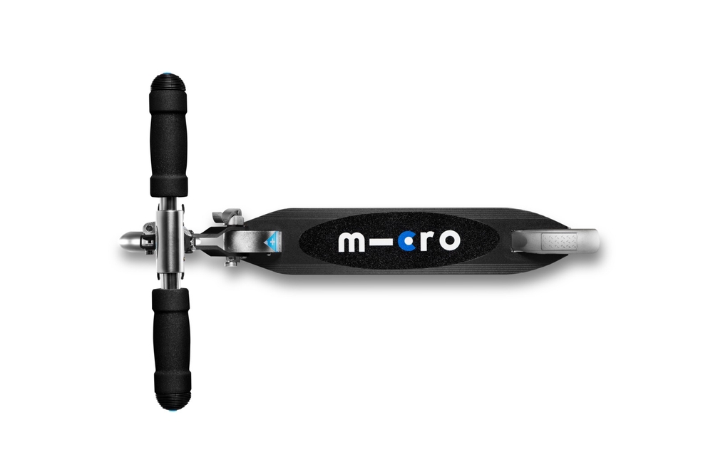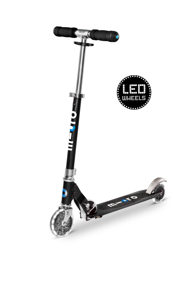 Micro Sprite LED is a compact and lightweight scooter (weighing approx. 2.85 kg) that can be easily folded and carried. It has a durable aluminum frame and an adjustable handlebar. It is well suited for riding on asphalt. Due to its smaller wheels, it is not as well suited for riding on roads with poor surface conditions. It is easier to ride on such roads with a Micro Cruiser scooter, for example, whose larger wheels overcome obstacles more smoothly.