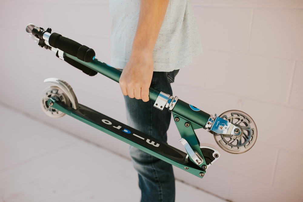 Micro Sprite LED is a compact and lightweight scooter (weighing approx. 2.85 kg) that can be easily folded and carried. It has a durable aluminum frame and an adjustable handlebar. It is well suited for riding on asphalt. Due to its smaller wheels, it is not as well suited for riding on roads with poor surface conditions. It is easier to ride on such roads with a Micro Cruiser scooter, for example, whose larger wheels overcome obstacles more smoothly.