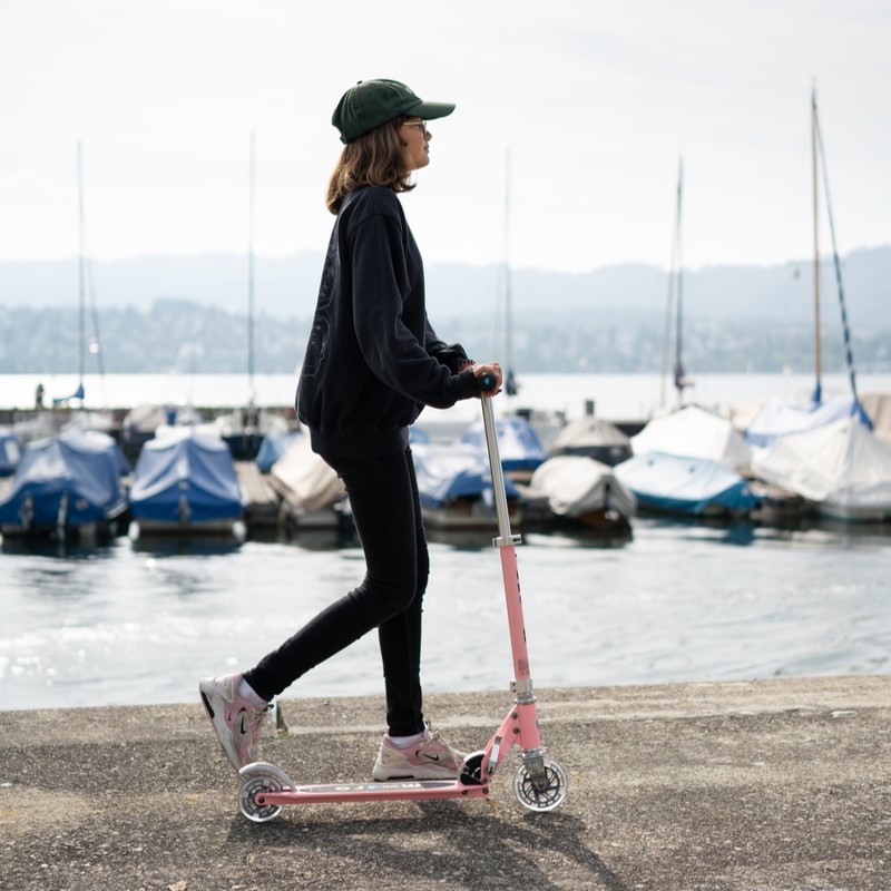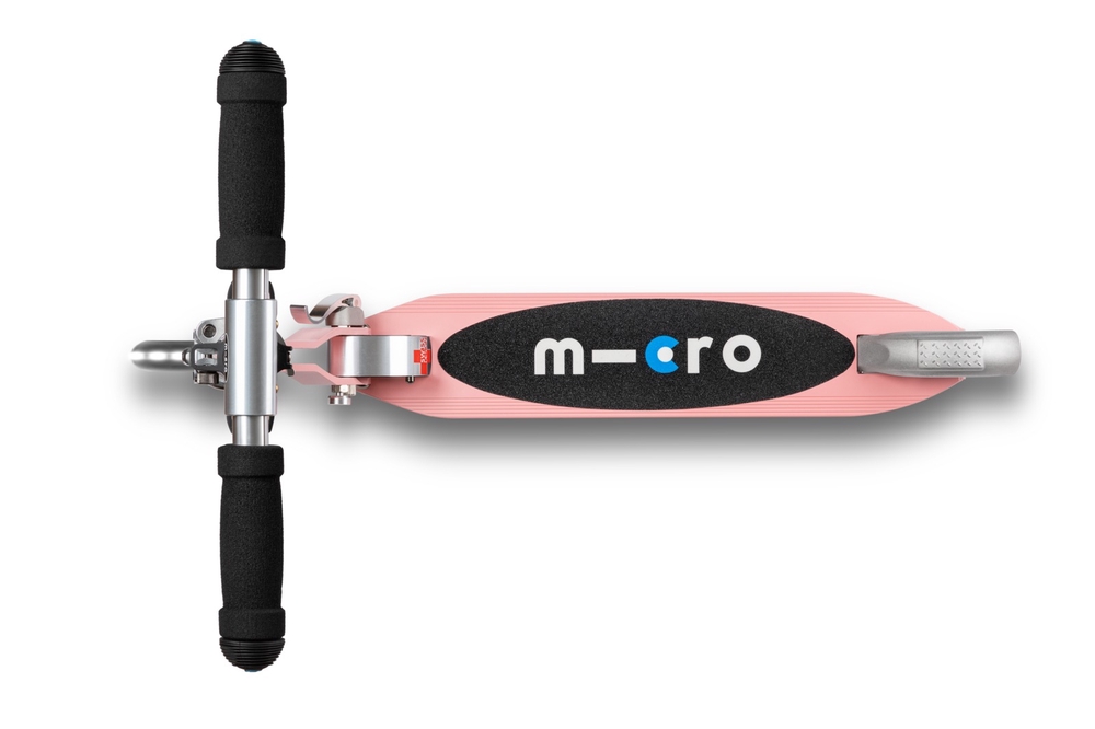 Micro Sprite LED is a compact and lightweight scooter (weighing approx. 2.85 kg) that can be easily folded and carried. It has a durable aluminum frame and an adjustable handlebar. It is well suited for riding on asphalt. Due to its smaller wheels, it is not as well suited for riding on roads with poor surface conditions. It is easier to ride on such roads with a Micro Cruiser scooter, for example, whose larger wheels overcome obstacles more smoothly.