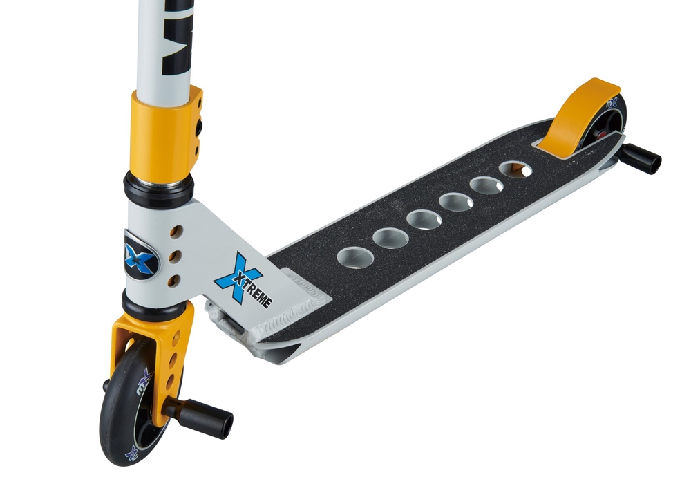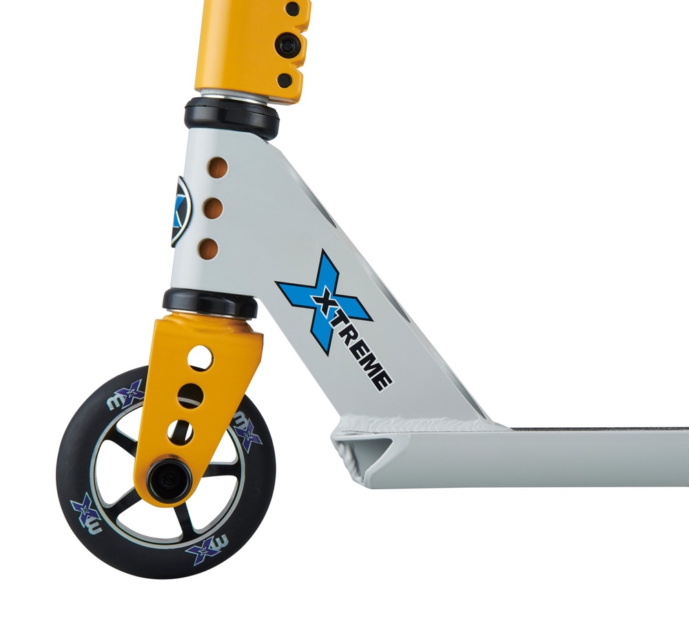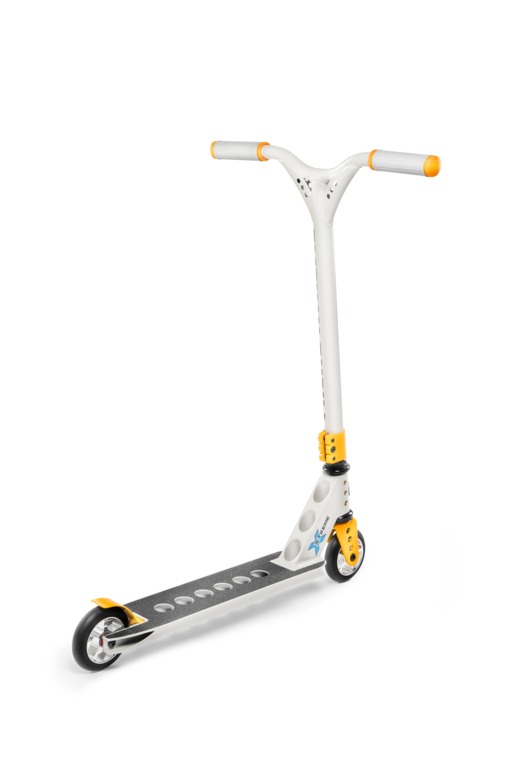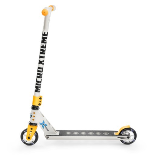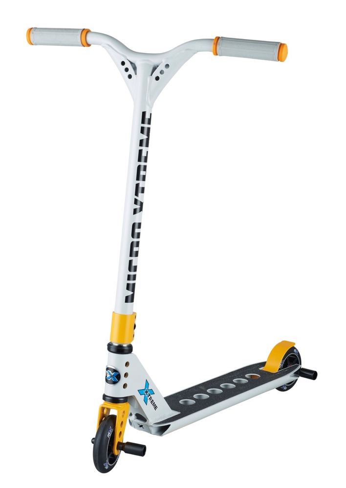 The Micro Trixx stunt scooter has a reinforced, one-piece aluminum handlebar, a non-slip concave aluminum 6061 deck, and a highly durable steel kickstand/brake. ABEC 7 bearings with metal cores ensure a fast and smooth ride both in the skate park and outside of it. A three-bolt clamp ensures that the handlebar stays securely in place while riding and performing tricks.nbsp;