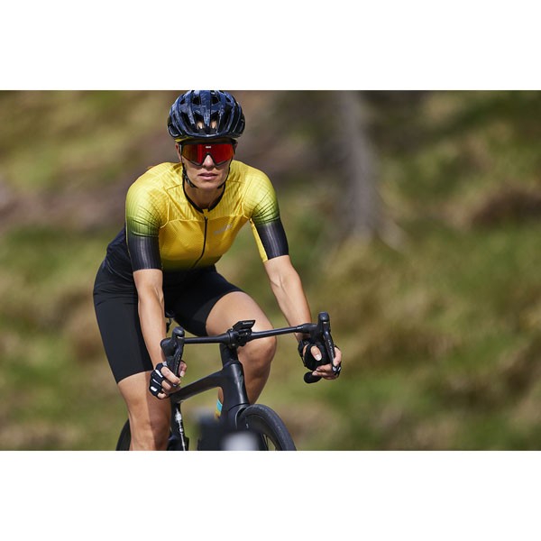 An aerodynamic jersey that feels like a second skin. The shoulders and sleeves feature a striped design that channels the wind. An extremely lightweight jersey that keeps the rider cool and dry even on hot days and tough climbs.