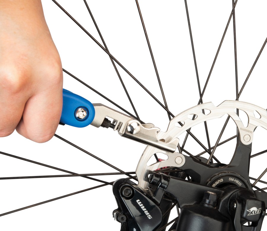 Compact tool kit containing many essential tools (e.g., brake disc bender, CO2 adapter, chain tool, etc.)
