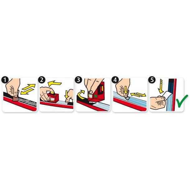 NB! Paigalda teip pidamisala mõlemast otsast vähemalt sentimeetri jagu lühemalt või vastavalt kliistriala märgistusele karestatud suusapõhjale ja siluda korralikult kinni otstest keskele kas pöidla või kaasa tuleva plastkaabitsaga