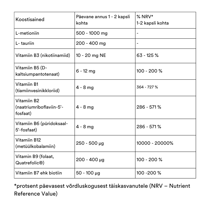 The dietary supplement is a comprehensive B-vitamin complex with four methylated B-vitamins (B2, B6, B9, B12) and four natural B-vitamins (B1, B3, B5, B7).