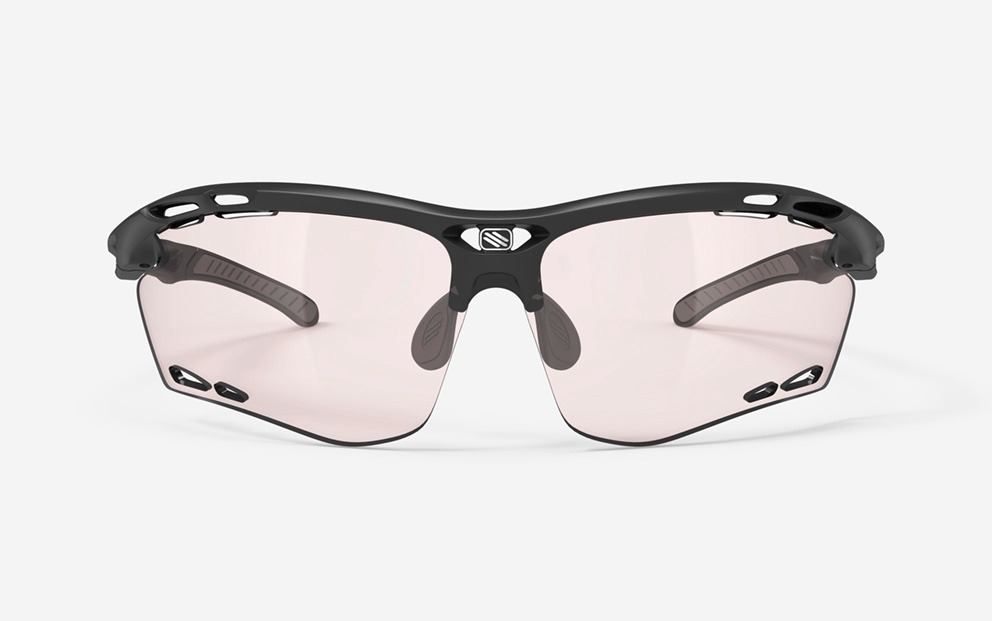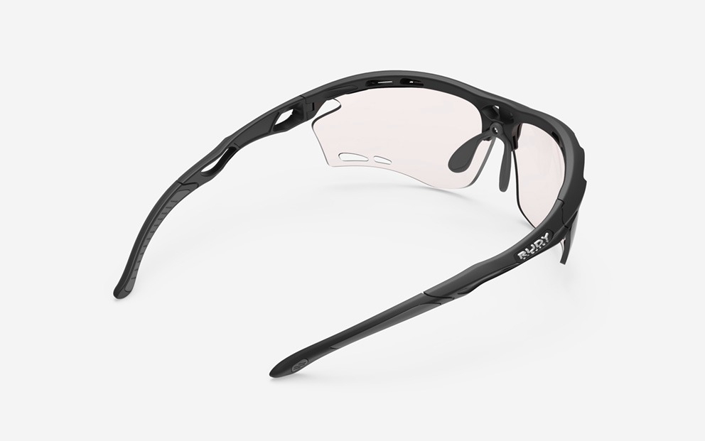 Rudy Project Propulse ImpactX photochromic (self-tinting) glasses. Propulse glasses are primarily designed for running – their light weight, secure fit and comfortable design make them the ideal companion for the running track. The end result is extremely comfortable and stable glasses with patented Hi-Grip temple tips, large ventilation holes in the front frame, lenses, and temples to prevent fogging. Wide lenses offer enhanced eye protection and a wide field of vision.——————————————-