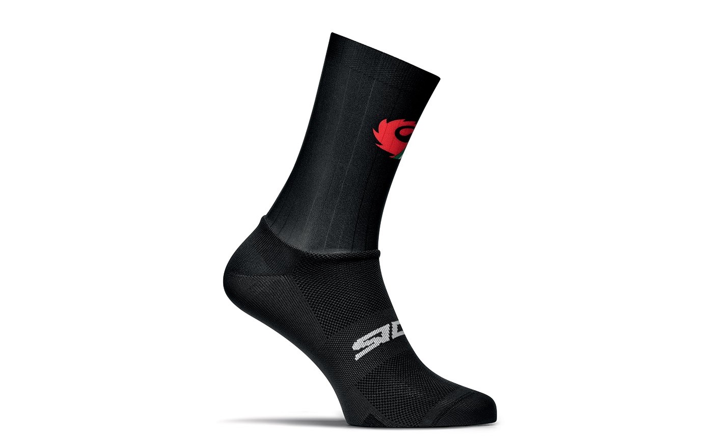 Sidi Dynamic aerosols The upper part of the sock is made of aerodynamic smooth Lycra material The leg of the sock has silicone dots to prevent the sock from slipping down Q-skin yarn – silver fibers in the sole material prevent bacteria growth and unpleasant odors A compression strip in the middle of the sole gives the foot a feeling of lightness Material: Foot section: 55% polyamide, 10% polypropylene, 35% elastane; leg section: 80% polyamide, 20% elastane Sizes: S/M (35-39) L/XL (40-43) XXL (44-46)