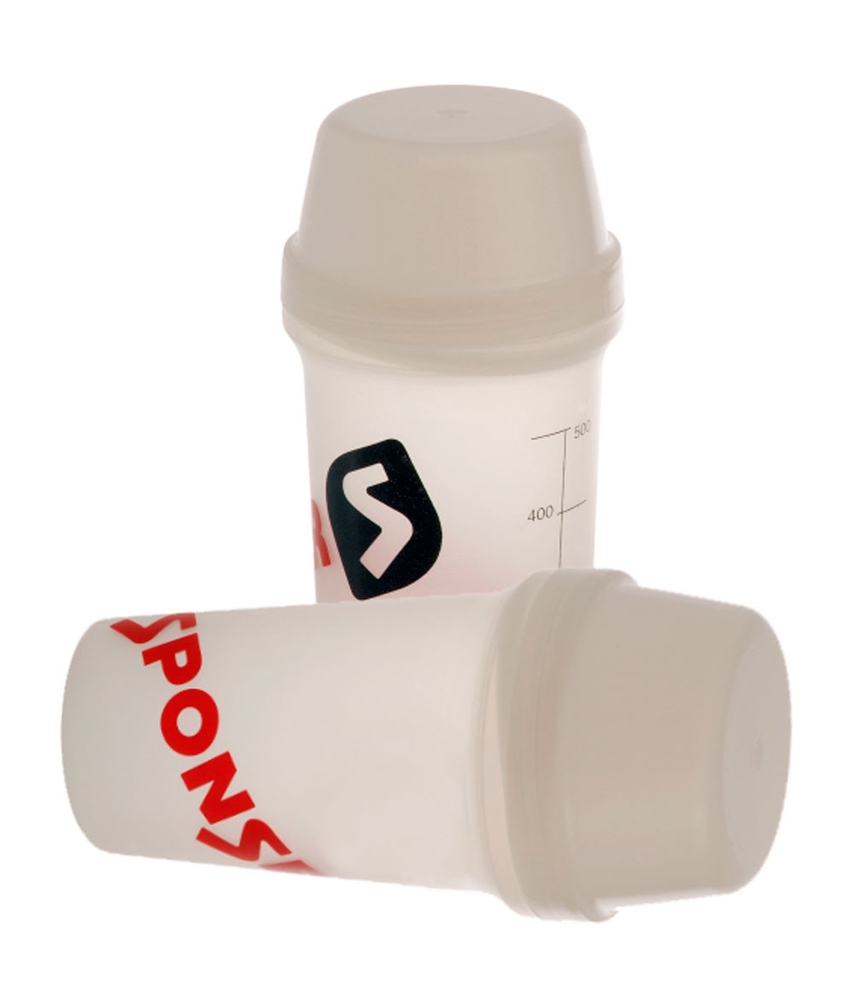 Sponser shaker for mixing recovery and protein drinks. With special mixing element and measuring scale. The screw cap can be used as a drinking cup.