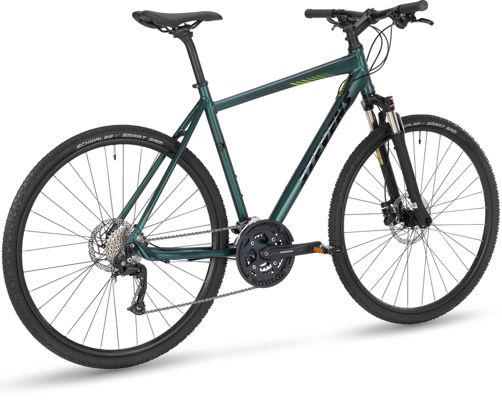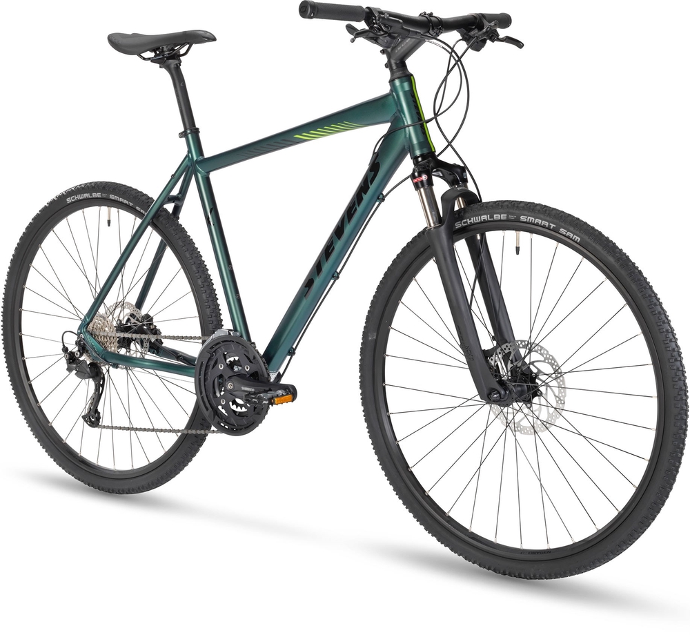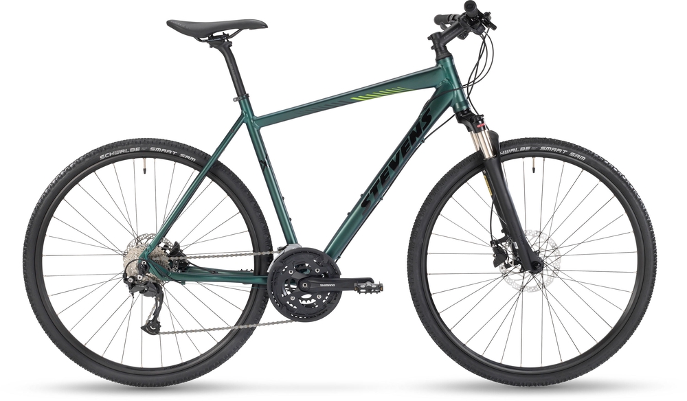 The Stevens 5X has a concrete design, nothing overly flashy, and is rather modest, blending in with the crowd. However, what it does not compromise on is comfort – the upright (relaxed) seating position and lightweight (triple butted) aluminum frame, in combination with Schwalbe 42mm wide tires, glide over the terrain like a knife through butter. If anything slows down your harmonious ride, it can only be good brakes!