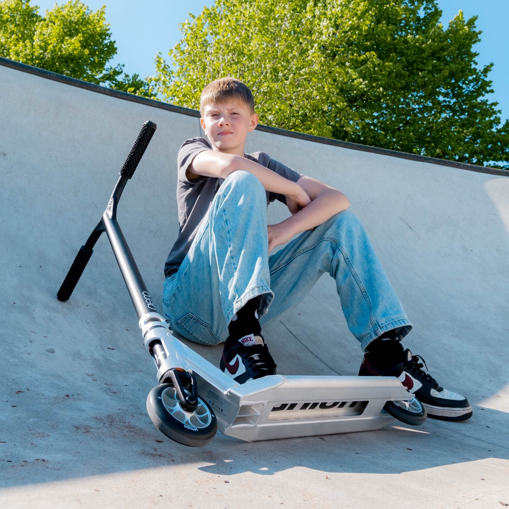 The Union Aero series stunt scooters are among the lightest (only 2.8 kg) mass-produced complete park scooters in their size class. This is an easy-to-handle and easy-to-control park scooter with curved deck edges that make learning tricks easier and safer – the ideal choice for young people starting out in stunt riding.